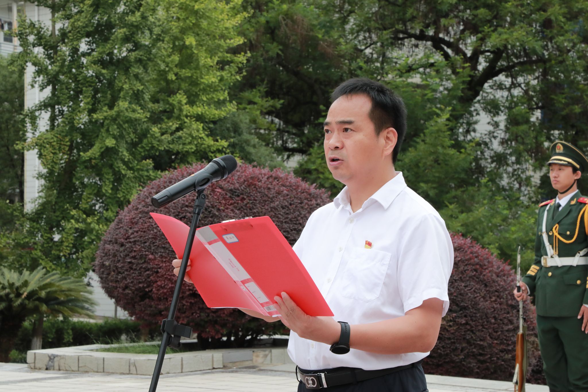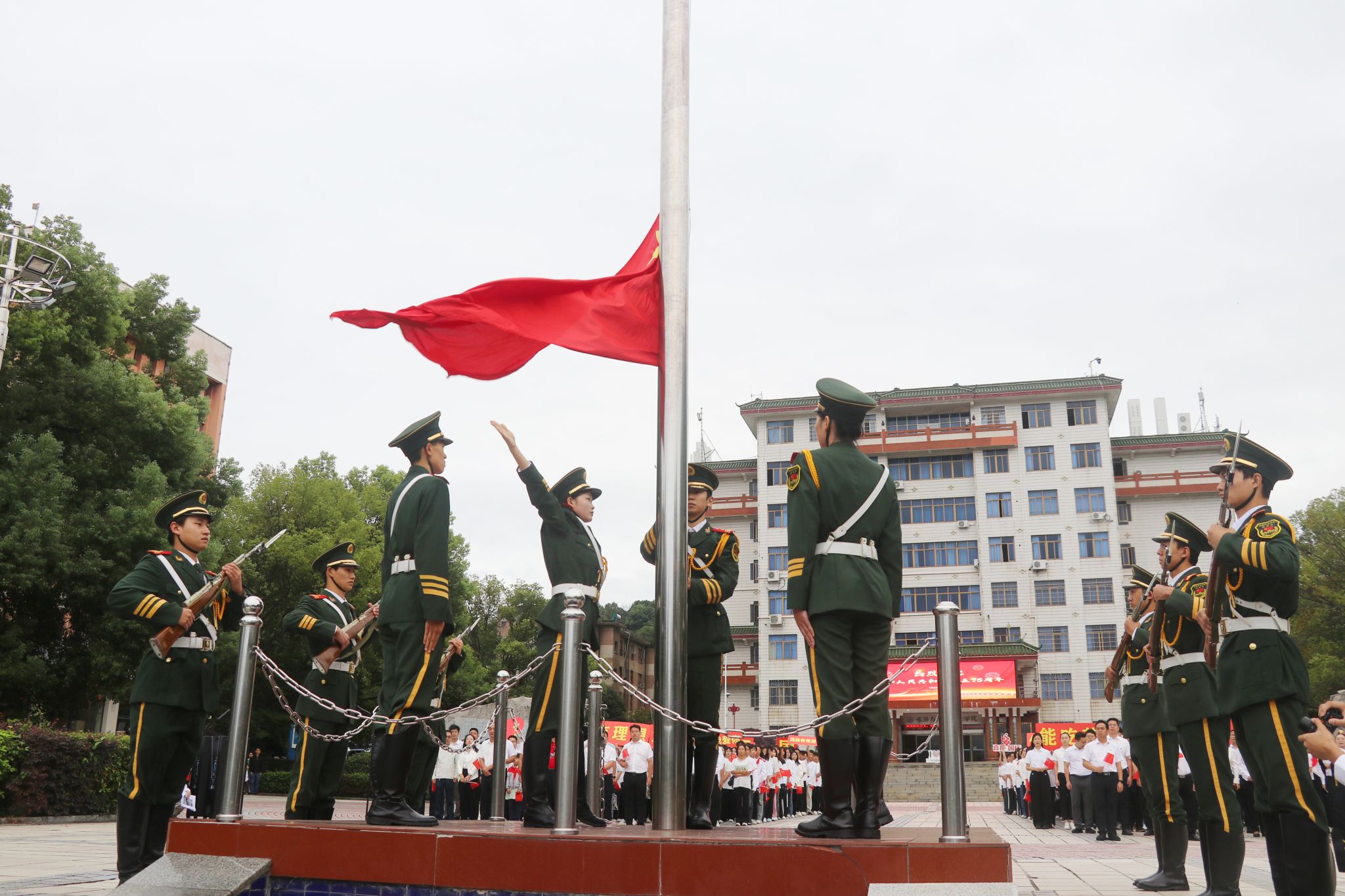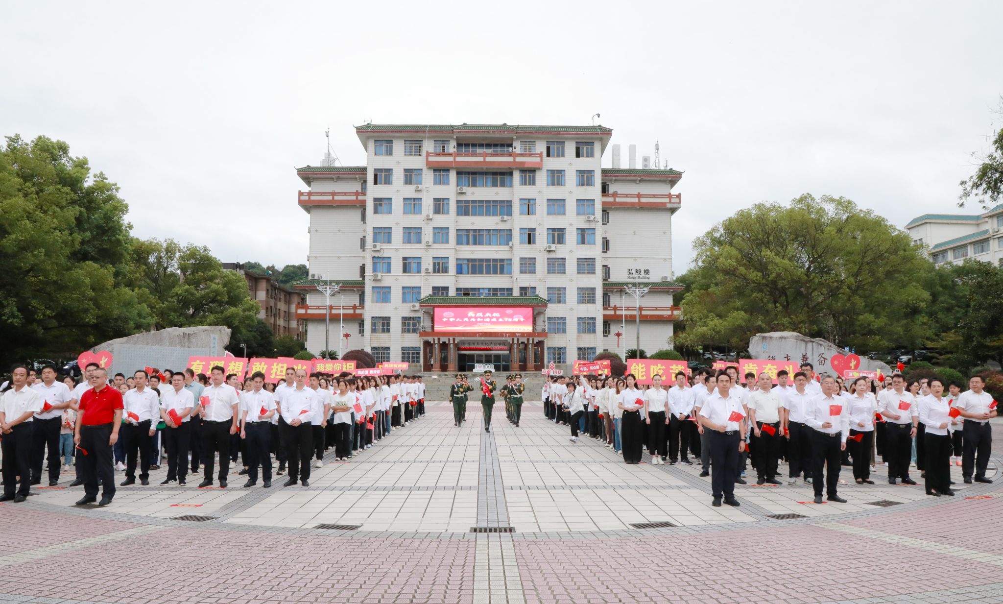 本网讯(记者 向薛峰 谢志豪)10月1日,学校在舜德广场举行“立报国强国大志向 做挺膺担当奋斗者”庆祝中华人民共和国成立75周年主题升旗仪式,学校师生代表近600人参加活动。