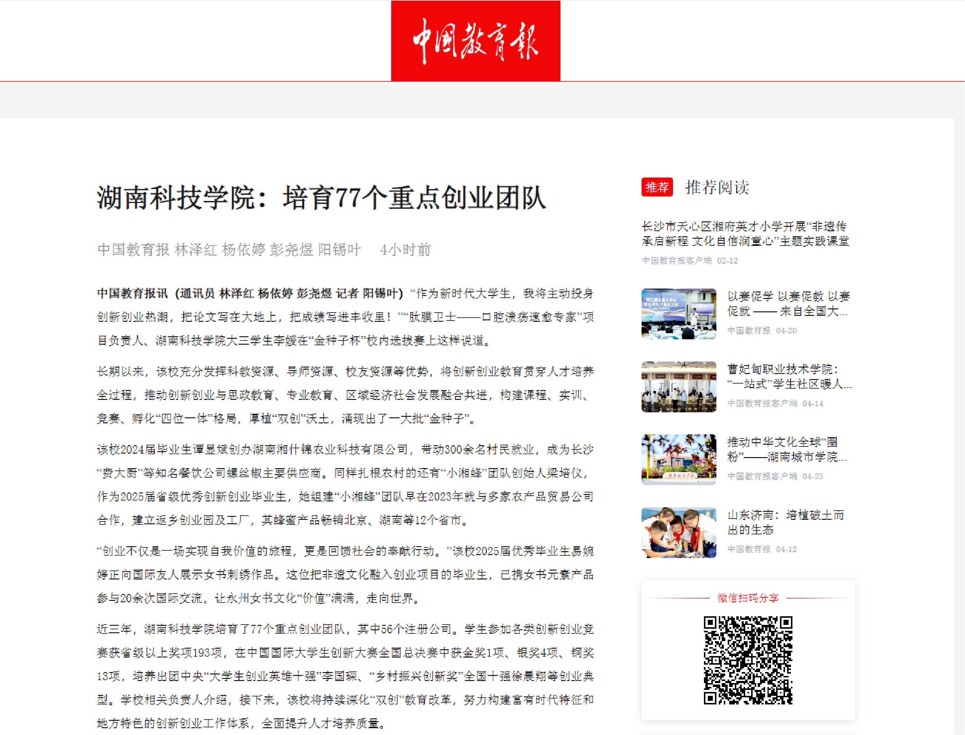 连续三次获评湖南省高校就业创业工作“一把手工程”,四次荣登湖南省支持大学生创业工作专报。