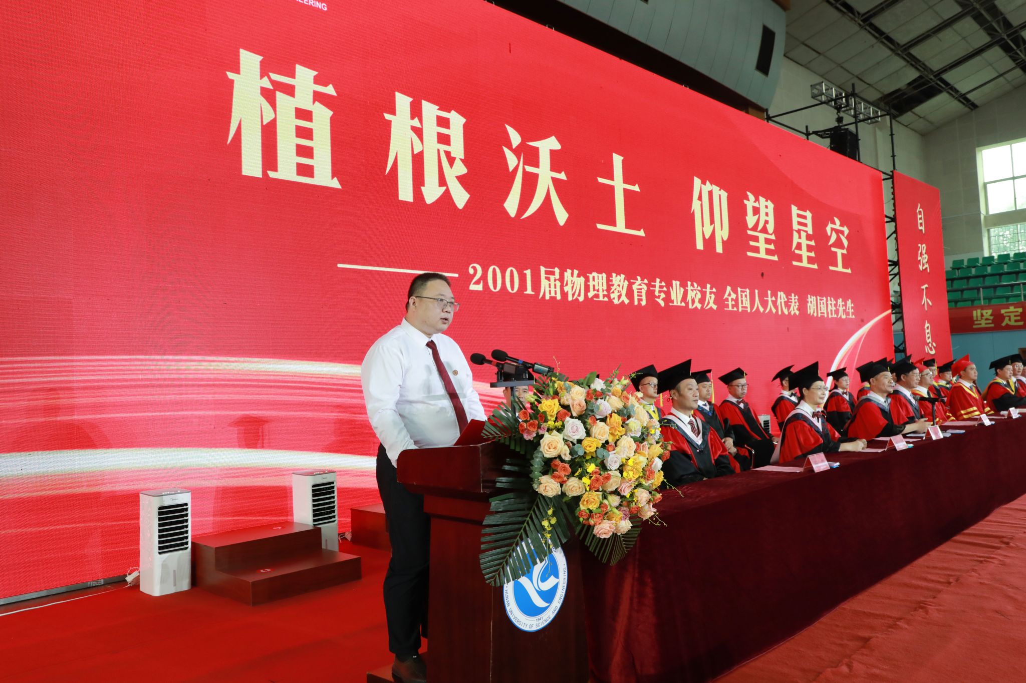 “未来的路还很长,但只要我们保持谦逊、务实的心态,不断学习和成长,就一定能够在各自的岗位上发光发热。”第十四届全国人大代表、伟德物理系9801班毕业生胡国柱作为优秀校友代表,对全体毕业生表示热烈的祝贺和殷切的祝福。