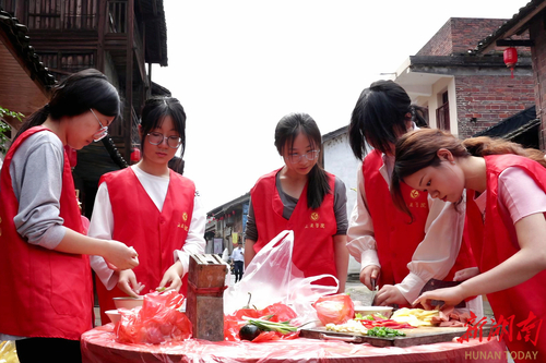 活动现场,学生志愿者化身秦奶奶的“贴心儿女”,纷纷积极行动起来。洗菜、配菜、起锅烧油......志愿者们有条不紊,分工明确,小小的屋子里很快就“香气四溢”。瘦肉鸡脚汤、上汤娃娃菜、肉沫莲藕、芹菜炒鸡蛋……志愿者们换着花样为秦奶奶做“暖心饭”,端上一道道热腾腾的菜肴。具有衡阳风味的秘制凉拌皮蛋是志愿者于蓉蓉的拿手好菜,“我们给奶奶带来的既是一餐饭,也是关怀和陪伴。”饭桌上她动情地说。