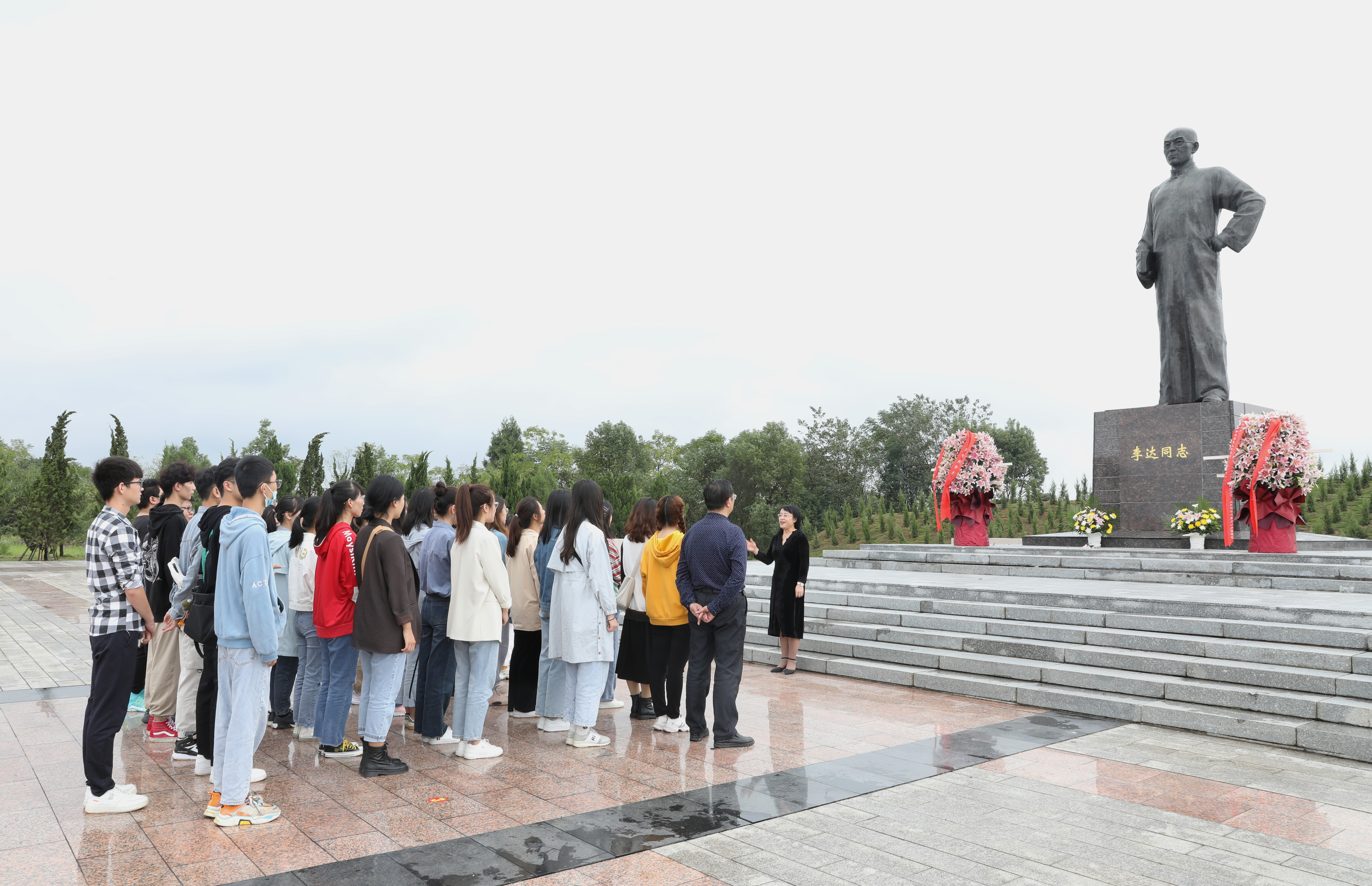 随后,全体师生来到李达同志铜像前,静默肃立,怀着无比崇敬的心情向李达同志铜像敬献花篮。