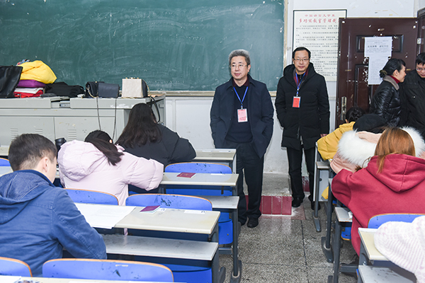 本网讯 1月7日,学校2018年下期期末考试拉开帷幕,考试时间将持续到1月16日。开考当天,党委书记、校长曾宝成亲临考场进行巡考,仔细察看考场秩序、环境卫生,并检查考试试题、答卷进度,不时驻足观看同学们的作答情况,对期末考试工作进行深入细致的检查。教务处、教学质量管理处等职能部门负责人参加。