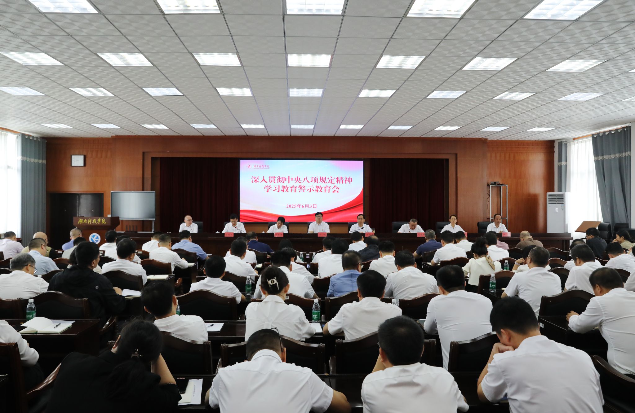 本网讯(记者 向薛峰 摄影 谢志豪)6月3日上午,学校举行深入贯彻中央八项规定精神学习教育警示教育会,全体党委委员、校领导,全体中层干部,关键岗位科级干部参加会议。