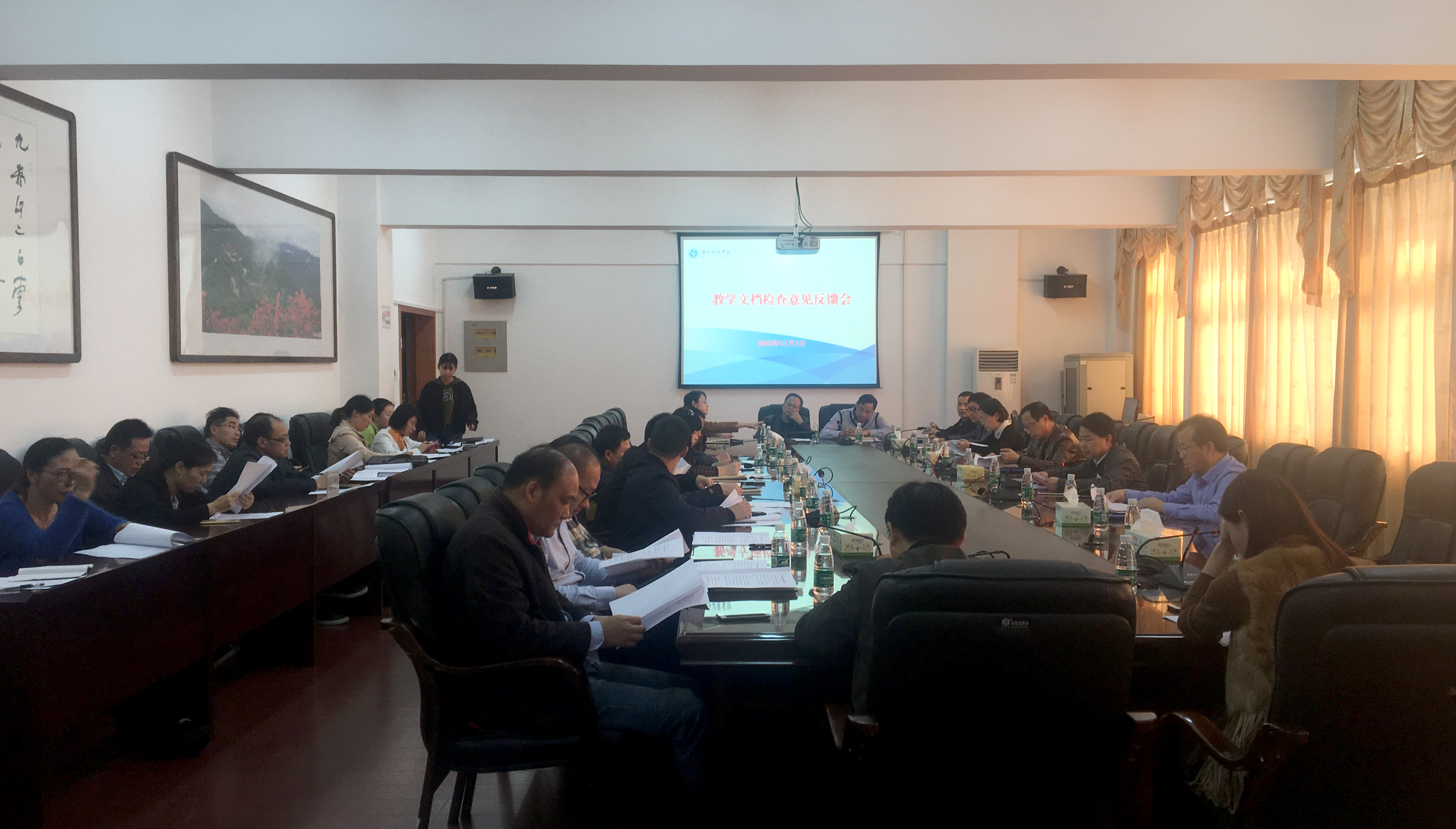 2018年11月1日下午,学校在行政办公楼六楼会议室召开了教学文档检查意见反馈会,会议由副校长李常健主持,各教学学院院长、分管教学副院长、教务办主任,教务处、教学质量管理处负责人与会。