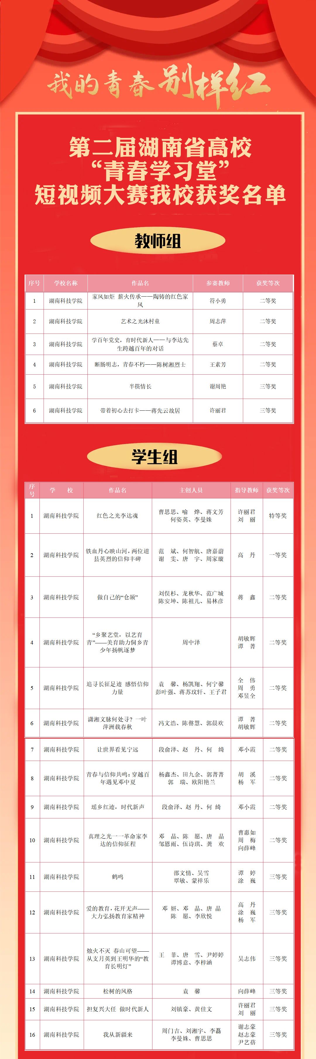 本网讯(记者 孙淑娴)近日,由中共湖南省委教育工委、湖南省教育厅、湖南日报社联合主办的湖南省第二届高校“青春学习堂”短视频大赛评选结果揭晓。伟德师生在赛事中表现优异,斩获特等奖1项、一等奖1项、二等奖12项、三等奖8项,并荣获“优秀组织奖”,充分展现了学校扎实推进思政教育的阶段性成果。