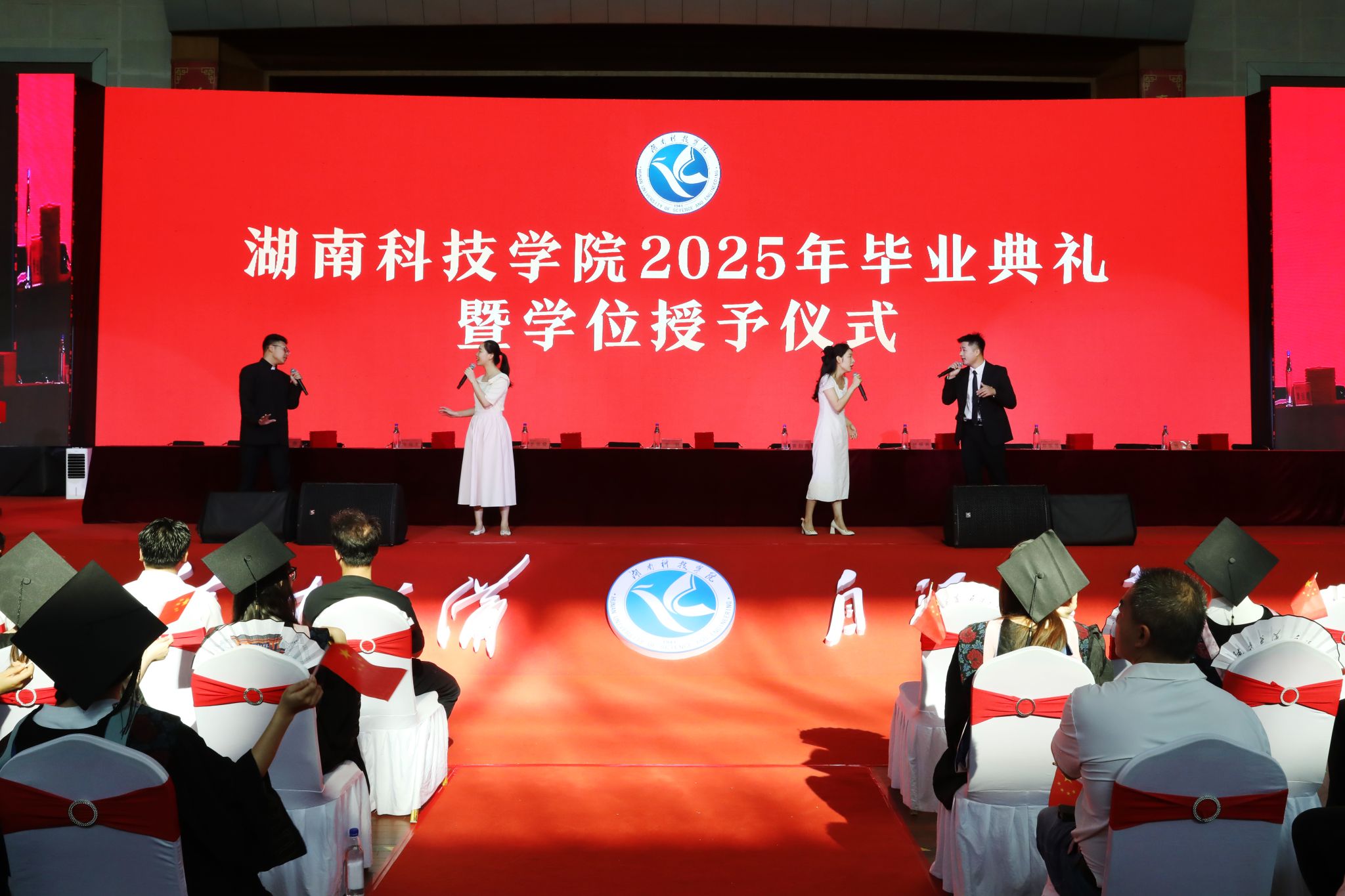 毕业典礼前,全体师生以歌声共鸣青春脉搏,表达对毕业生们最美好的祝福,紧随其后的《遇见・湘科院》原创毕业短片,用光影勾勒了学子们的成长轨迹,既串联起大学四年的珍贵记忆,更表达出他们对未来人生的憧憬与向往。