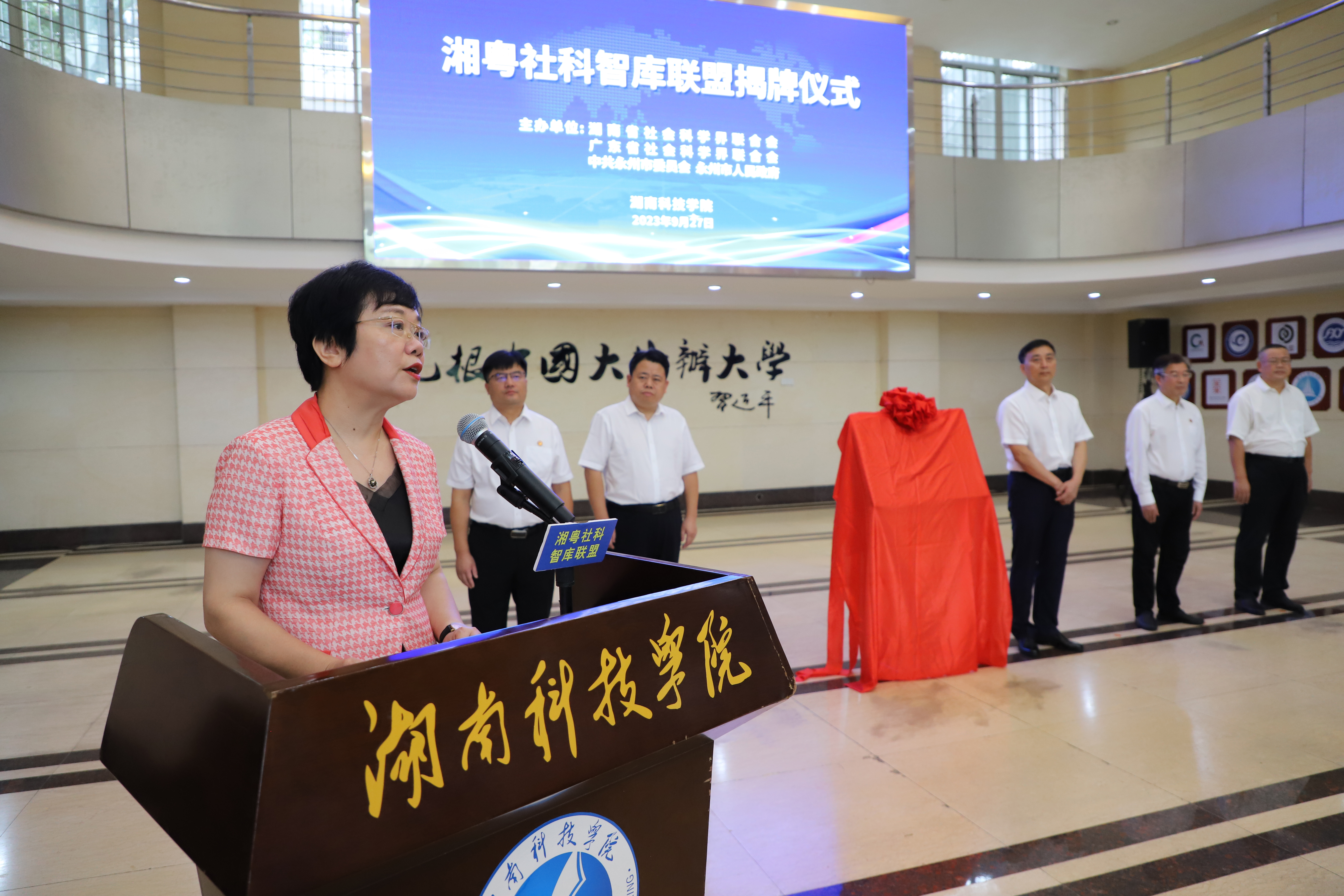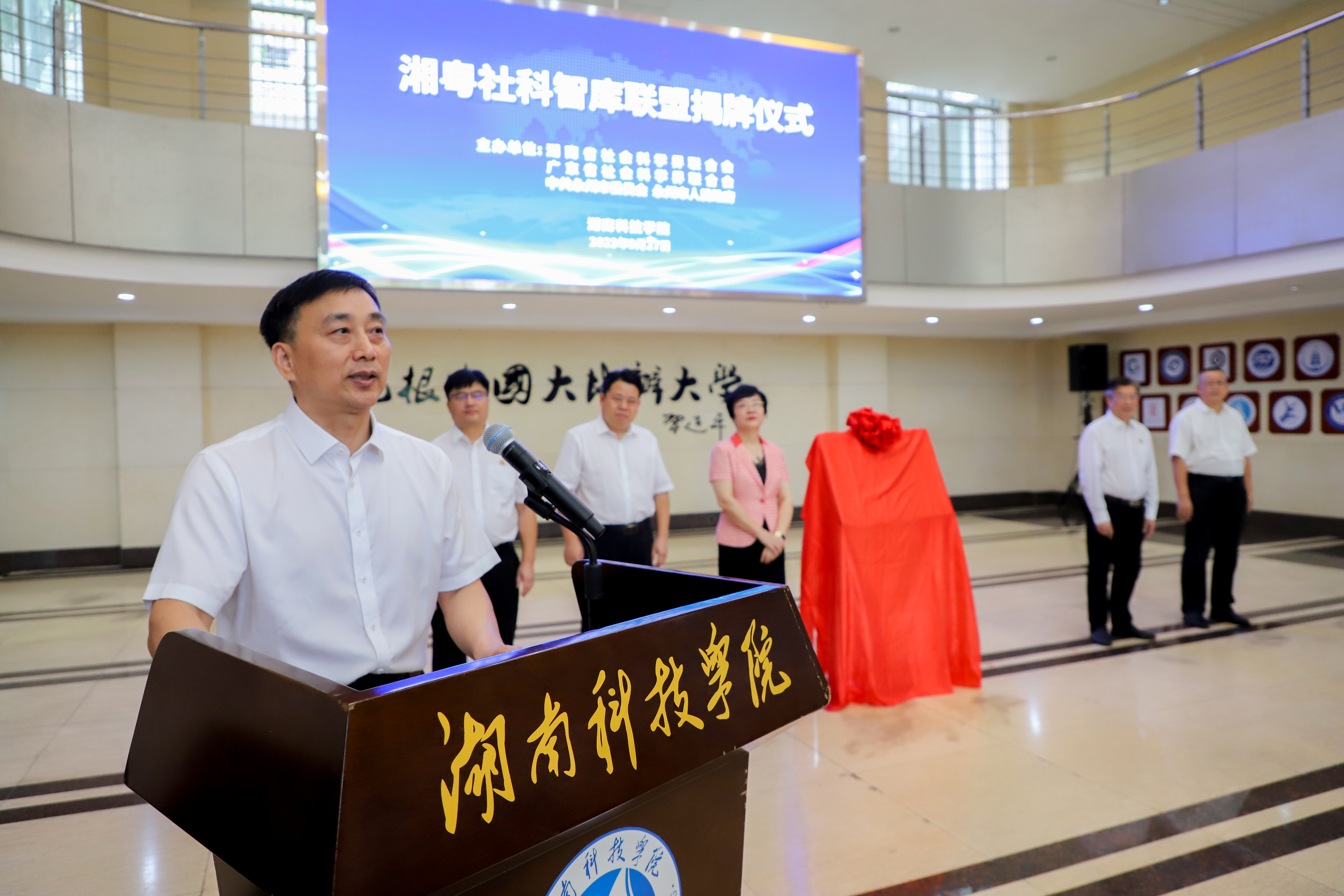 余鸿纯表示,“湘粤社科智库联盟”是新时代推动中国特色新型智库建设的创新举措,充分体现了社科界围绕中心、服务大局的担当意识。要以更大力度、更实措施开展与湖南省等省际社科联的交流合作、优势互补、强强联手,为推动经济社会发展、共同迈向现代化贡献更多社科智慧。要共同开展专项课题研究,多方促进交流合作、积极联合举办学术论坛,全面增加培训力度,大力开展湘粤区域协同发展研究和对外推广宣传,当好新时代社科事业的“见证者、参与者、推动者”,为湘粤哲学社会科学事业高质量发展贡献智库联盟力量,谱写新时代粤湘两省社科界深化合作的华美篇章。