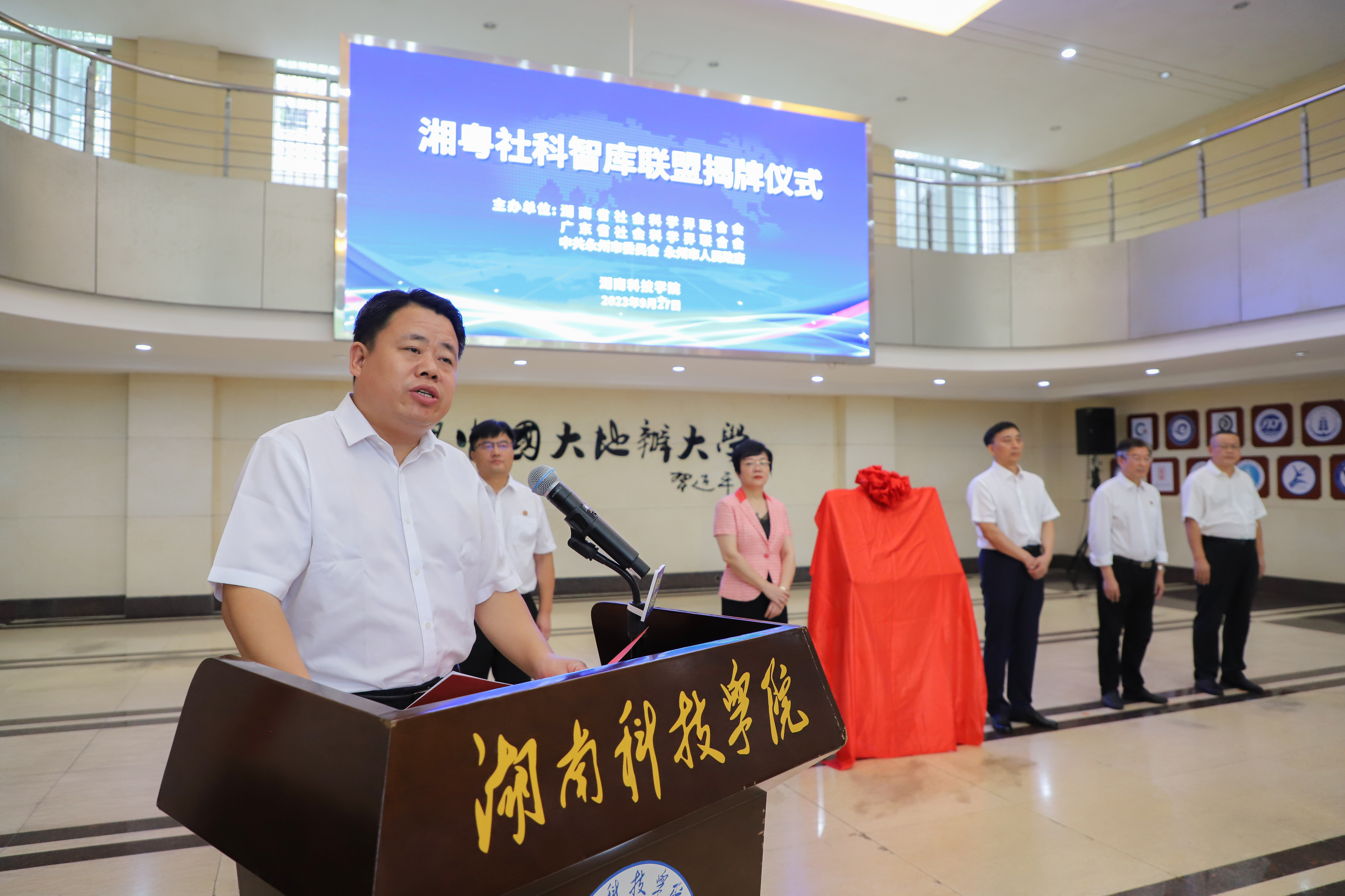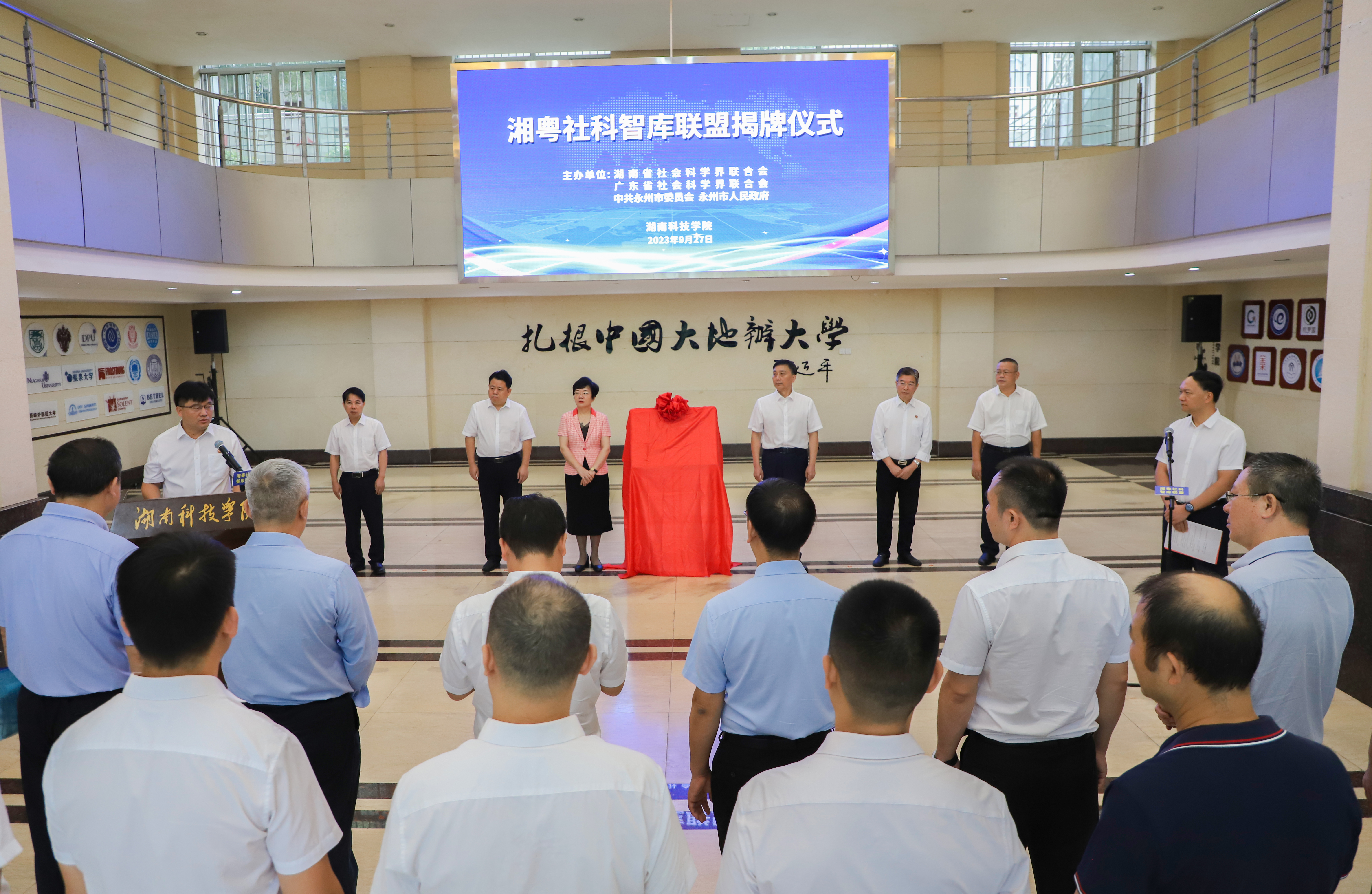 余鸿纯、王和平、刘厚、李钢共同为“湘粤社科智库联盟”揭牌。
