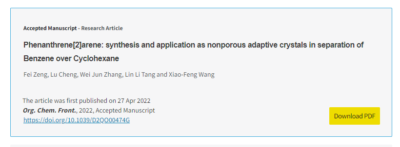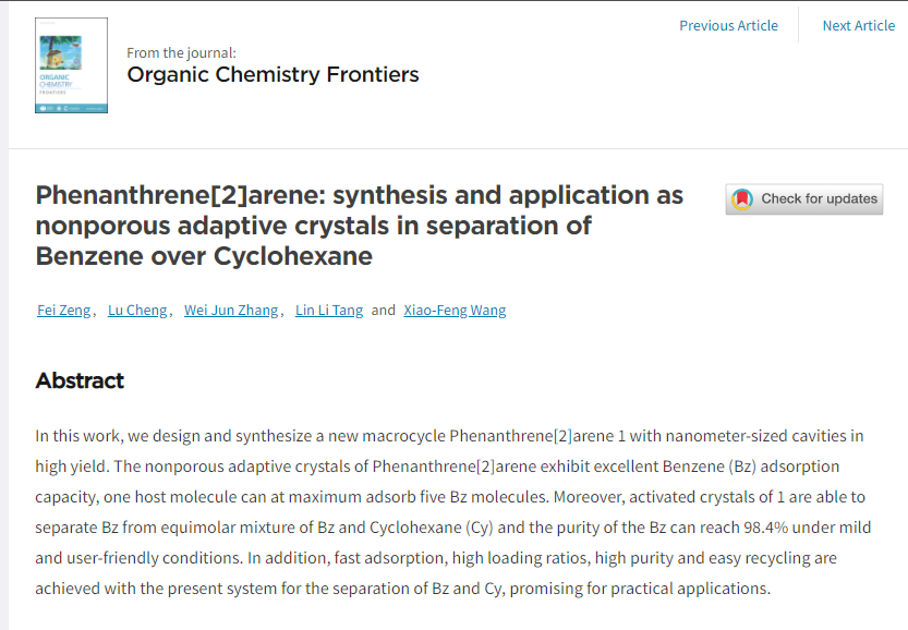 本网讯 近日,国际知名期刊Organic Chemistry Frontiers,DOI:10.1039/D2OO00474G(中科院一区TOP,IF= 5.281)发表了伟德源自英国1946化学与生物工程学院功能材料团队的最新研究成果“Phenanthrene[2]arene: synthesis and application as nonporous adaptive crystals in separation of Benzene over Cyclohexane”(菲[2]芳烃的设计合成及非多孔自适应性晶体分离苯与环己烷的应用研究),该研究成果由功能材料团队成员独立完成,曾飞博士为第一作者和通讯作者。