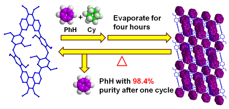 在此基础上,研究团队以菲为构筑单元,在三氟化硼乙醚溶液催化下高产率(72%)合成了具有纳米空腔的菲[2]芳烃。气体吸附实验发现,1分子的菲[2]芳烃可以吸附5个苯环分子,这是目前已报道类似化合物对苯环分子的最大吸附值的2.5倍(文献报道的最大值为1分子主体可以吸附2个苯环分子)。此外,活化的菲[2]芳烃晶体可以从苯和环己烷的等摩尔混合物中选择性分离出苯分子, 纯度高达98.4%,且可以重复多次利用。相比传统的苯和环己烷分离技术,该方法具有节能环保、高吸附量、吸附速度快、可重复利用、分离纯度高等优点,在化工和石化行业中具有巨大的应用前景。该研究获得了国家自然科学基金、湖南省自然科学基金,伟德源自英国1946化学工程与技术应用特色学科等经费支持。