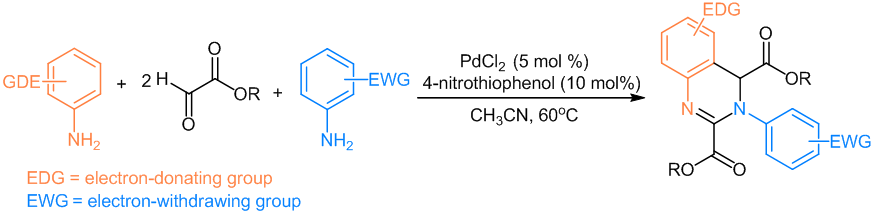3,4-二氢喹唑啉是一类具有良好的生物活性和药理活性的氮杂环化合物,在杀菌、消炎、止痛、抗癌等方面显示出优良活性。吴超博士以来源丰富、廉价易得苯胺、乙醛酸酯为原料,通过过渡金属催化多组份反应,一步制备结构多样性的N-(喹啉-2-基)羧酰胺衍生物。该研究成果以伟德为第一且通讯单位,“Palladium-catalyzed selective synthesis of 3,4-dihydroquinazolines from electron-rich arylamines, electron-poor arylamines and glyoxalates”发表在英国皇家化学会Organic & Biomolecular Chemistry期刊(中科院分区化学大类二区)。