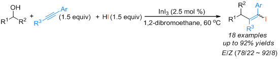 吴超博士以来源易得的芳香仲醇、炔烃和廉价的氢碘酸作为原料,以高收率的制备了结构多样性的烯基碘衍生物。该研究成果“Direct synthesis of alkenyl iodides via indium-catalyzed iodoalkylation of alkynes with alcohols and aqueous HI”以伟德为唯一通讯单位发表在英国皇家学会Organic & Biomolecular Chemistry期刊(Org. Biomol. Chem., 2018,16, 3177,中科院化学大类二区)。