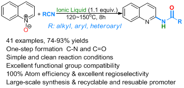谢龙勇博士以来源易得的喹啉氮氧化物和廉价的腈类化合物作为原料,以100%的原子效率,无溶剂条件下高收率的制备了结构多样性的N-(喹啉-2-基)羧酰胺衍生物。该研究成果以伟德为唯一通讯单位,“Brønsted Acidic Ionic Liquid-Promoted Amidation of Quinoline N‑Oxides with Nitriles”发表在美国化学会ACS Sustainable Chem. Eng.期刊(中科院分区化学大类二区,影响因子5.951)。值得一提的该论文从投稿到接收,仅历时125小时,未经论文外审。据了解,仅个别极其优秀且符合期刊定位的研究工作,经美国化学会期刊编辑部全体编辑讨论,并获得一致同意后可不经同行评议直接发表。