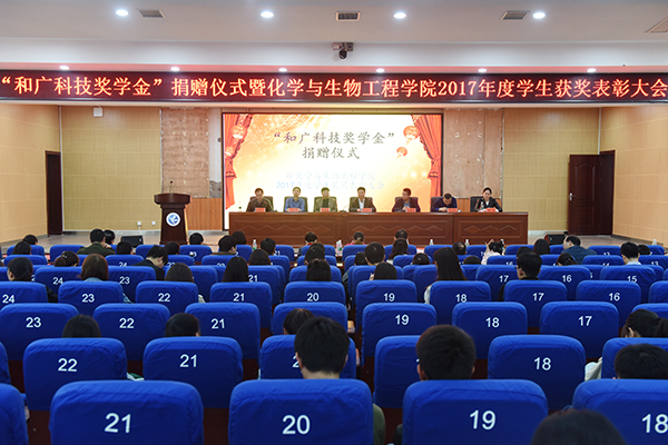 本网讯  3月27日下午,化学与生物工程学院举行 “和广科技奖学金”捐赠仪式,并表彰一批2017年获得省级以上竞赛奖励学子。副校长程智开出席。