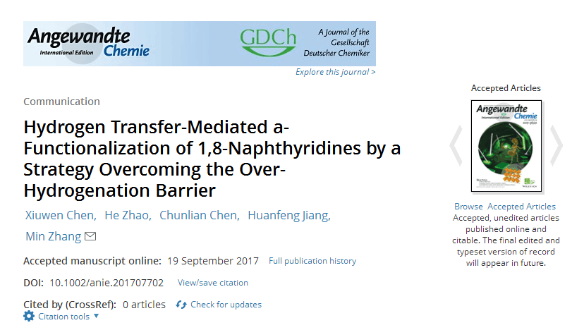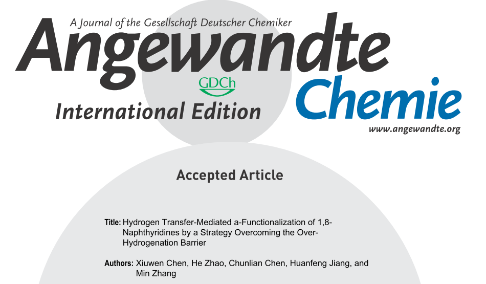 本网讯 近日,伟德化学与生物工程学院陈修文博士以第一作者身份,在化学领域顶级期刊Angewandte Chemie(影响因子:11.994)上在线发表专题论文《Hydrogen Transfer-Mediated -Functionalization of 1,8-Naphthyrid- ines by a Strategy Overcoming the Over-Hydrogenation Barrier》。