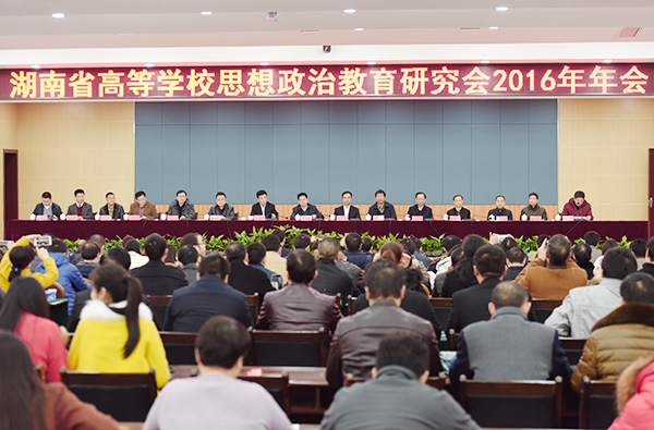 本网讯 1月6日上午,湖南省高校思想政治教育研究会2016年年会在伟德教师发展中心举行。湖南省教育厅党组成员、省委教育工委委员陈飞跃,伟德党委书记陈弘,中南大学党委常委、副校长黄建陵,研究会副会长、湖南商学院党委副书记夏继春,研究会副会长、湖南铁道职业技术学院党委书记钟建宁等出席年会。共有来自全省75所高校的140余名代表出席会议。