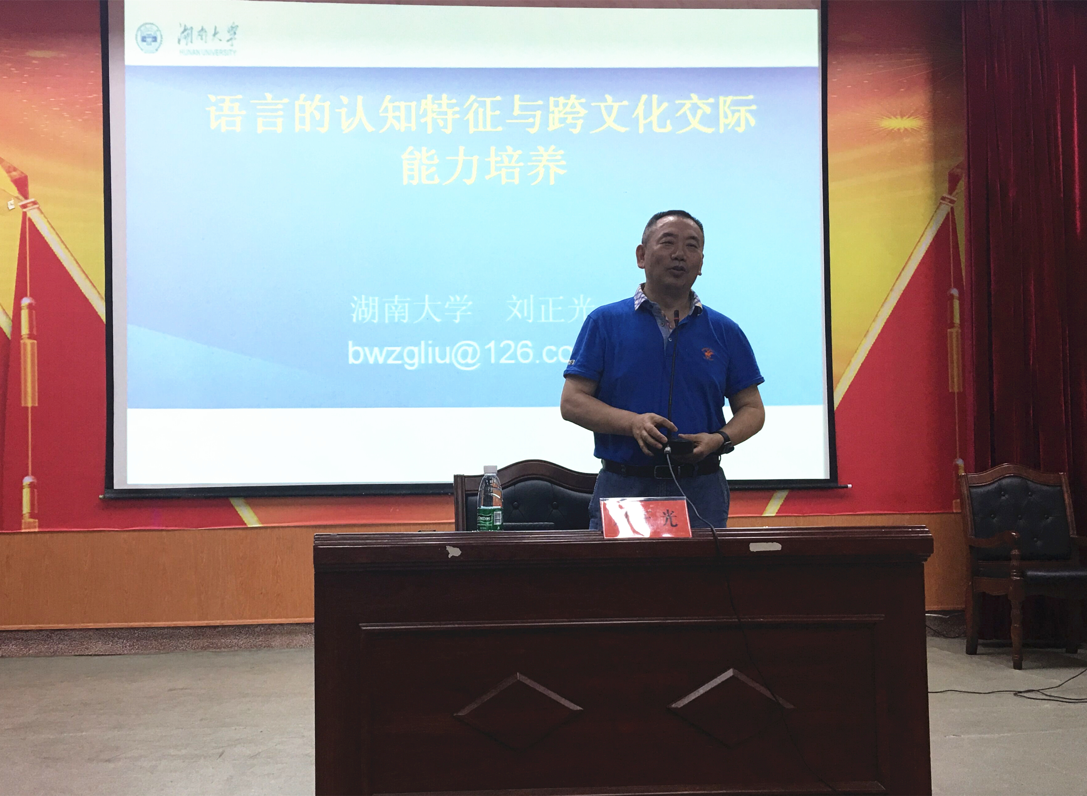 刘正光教授作了题为“语言的认知特征与跨文化交际能力培养”的学术报告,他结合实际教学,深入分析了外语教学中长期存在的“准确性不强”、“流利性不强”和“思辨能力不强”等问题产生的原因,并围绕“语言的三个基本特征”、“三个基本特征对外语教学的启示”、 “跨文化交际能力培养融于语言教学”三个方面进行了详细的阐述。他强调语言学习不能缺少实践,希望同学们加强词汇语法学习,提高写作翻译能力。