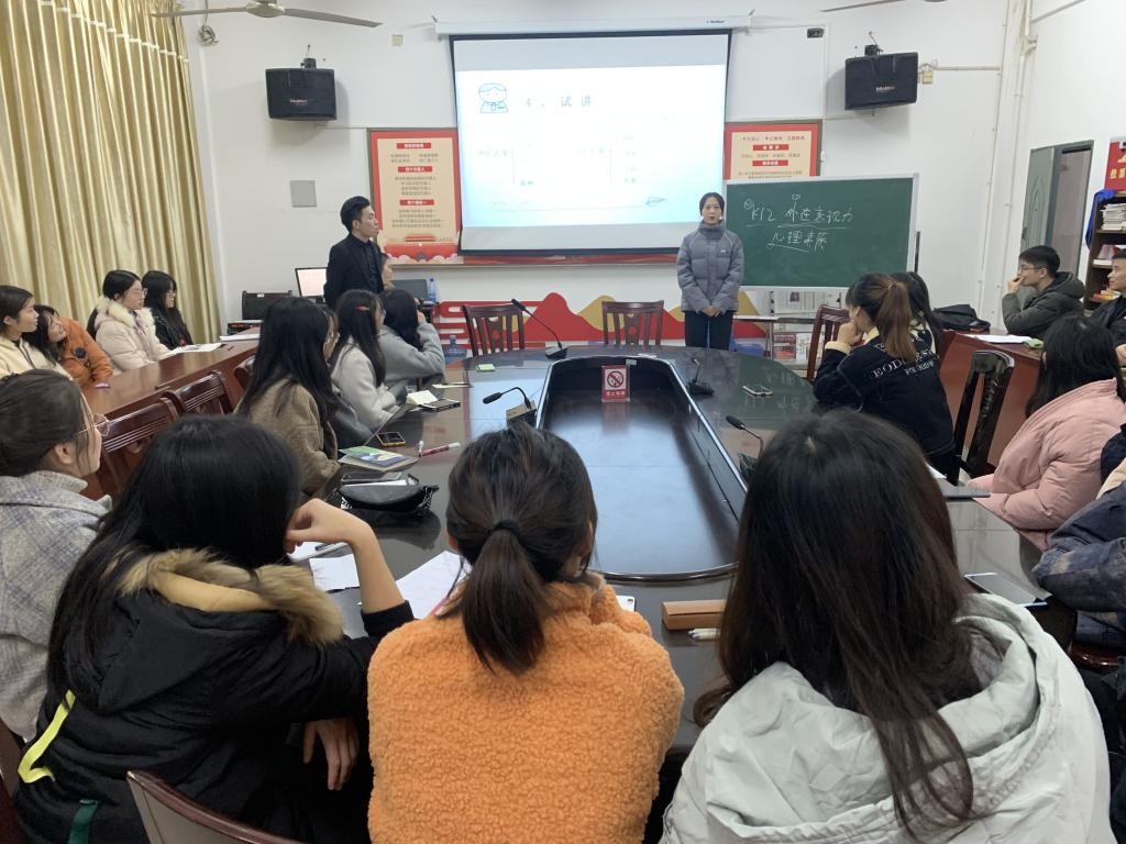 瞿鹏毕业后一直从事教师资格证考试、教师招聘考试指导工作,有着丰富的教学和实践经验。当晚,瞿鹏结合自己的学习和工作经历,和学弟学妹们畅谈心得体会,传授面试技巧。他回想求学经历,告诫学弟学妹珍惜大学时光,好好学习;结合自己的工作经验,从候场、备课、结构化面试、试讲、答辩、离场等环节详细讲解了教师资格证面试中的技巧与注意事项;邀请同学进行现场展示。