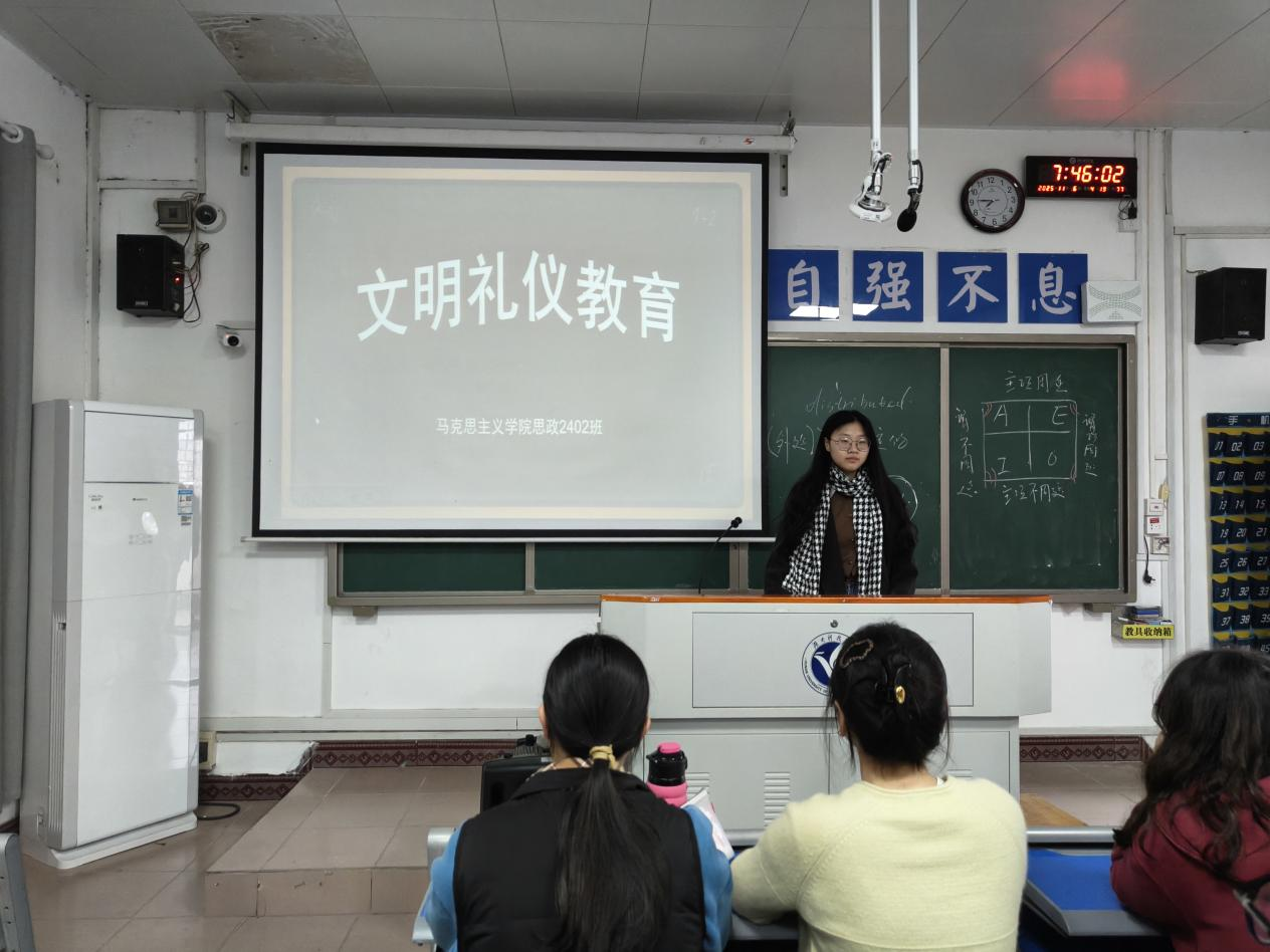 本网讯(记者 赵颖雪)为深入培育和践行社会主义核心价值观,引导青年学生树立文明观念、涵养道德情操、规范行为举止,近期,马克思主义学院组织各班级集中开展 “践行文明礼仪,绽放青春风采” 主题班会,让文明之风浸润校园,让青春底色更显鲜亮。