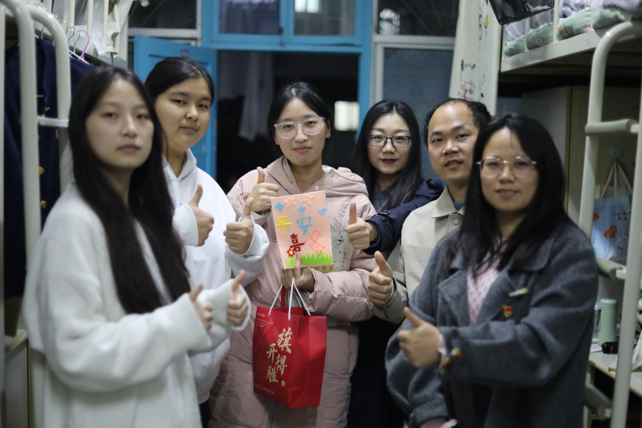 当天晚上,我院副院长唐立及辅导员曹惠如、吴志伟老师深入寝室,亲切询问考研学子复习进度与困难,叮嘱大家科学备考、劳逸结合,鼓励学子放松心态、坚定信心,并为学子送上定制“加油包”,内含小零食、印有校园风景的明信片、实用文具和学弟学妹们手作创作的不织布挂件。当这些满载心意的礼包送到考研学子手中时,同学们难掩惊喜,备考的疲惫仿佛被这份温暖瞬间消融。