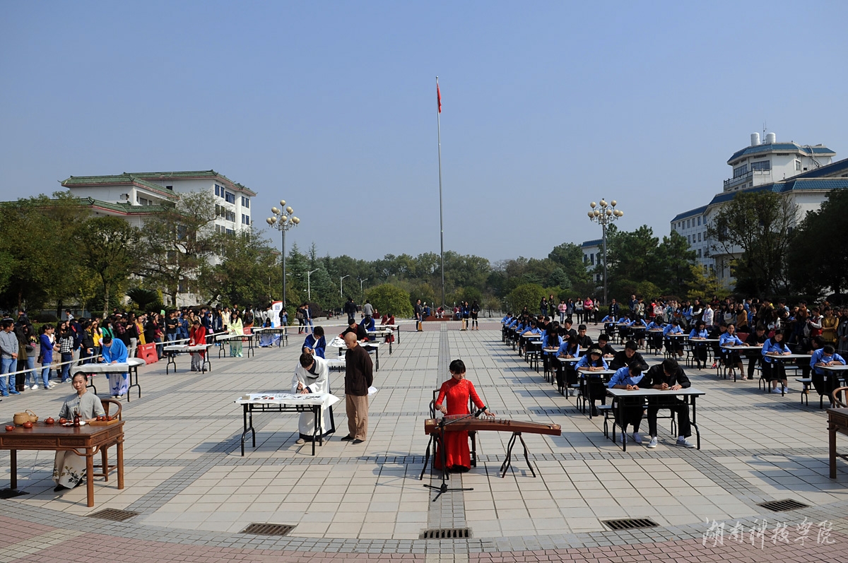 当日中午,学校在文化广场举行现场书法大赛,其中硬笔组学生着民国服装,软笔组学生着汉服,闻着余音袅袅的古筝琴音,伴着幽幽茶香,现场书写年华,为现场观众完美展示了书法的笔精墨妙,宛如天籁的古典琴音及和静怡真的茶道表演,把中国博大精深的传统文化与艺术之美巧妙融合,展示了无与伦比的人文艺术之美。此种新颖独到、乐于为学子所接受的形式,以崭新的视角淋漓尽致地呈现出中华传统文化的独特魅力。活动负责人美术系党总支副书记刘华告诉记者,“我们举办现场书法大赛,巧妙的将茶艺、传统器乐融入其中,让大学生能切身感受到传统文化的魅力,并引导大学生发扬和传承传统文化之精髓。”