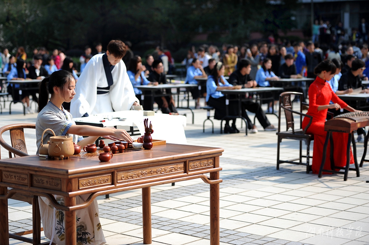 本网讯 (记者李瑛 摄影 何帅文 李国家) 枫红寒露染潇湘,琴醉茶道翰墨香。11月14日,伟德近千名师生陶醉在悠扬婉转的古筝声中,闻着淡淡的茶香,欣赏了一场学子着汉服、民国服装现场挥毫泼墨的弘扬传统文化的视觉盛宴。