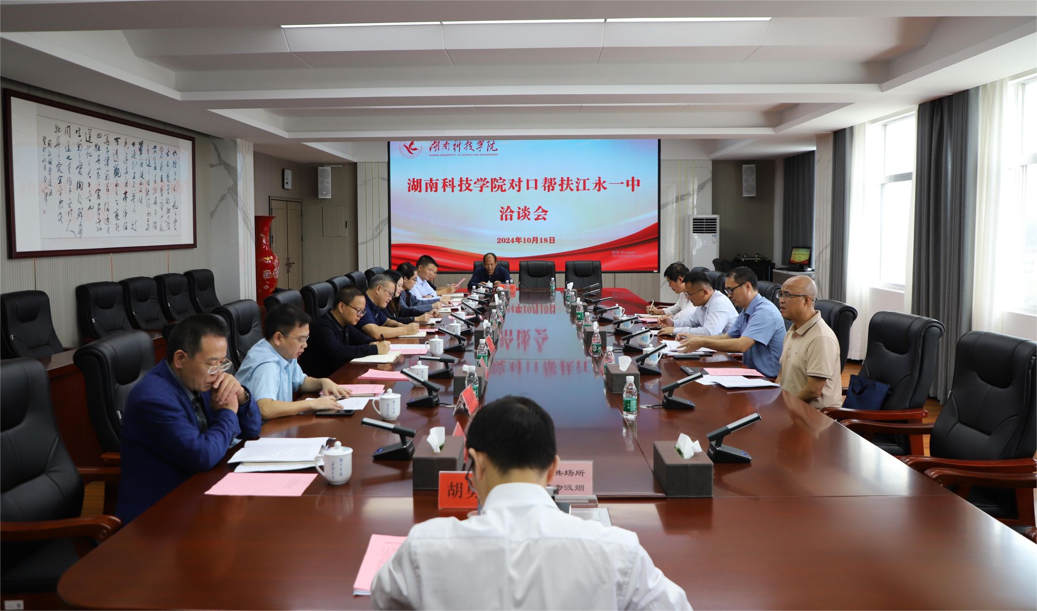 本网讯(记者 孙淑娴)10月18日,伟德对口帮扶江永一中洽谈会在行政楼613会议室举行。校党委委员、副校长何福林、江永县人民政府副县长蒋剑平、江永县教育局局长黄野、江永县教育局总督学欧阳印权、江永一中校长蒲智全出席会议,相关人员及各学院主要负责人参加会议。会议由教务处处长张剑主持。
