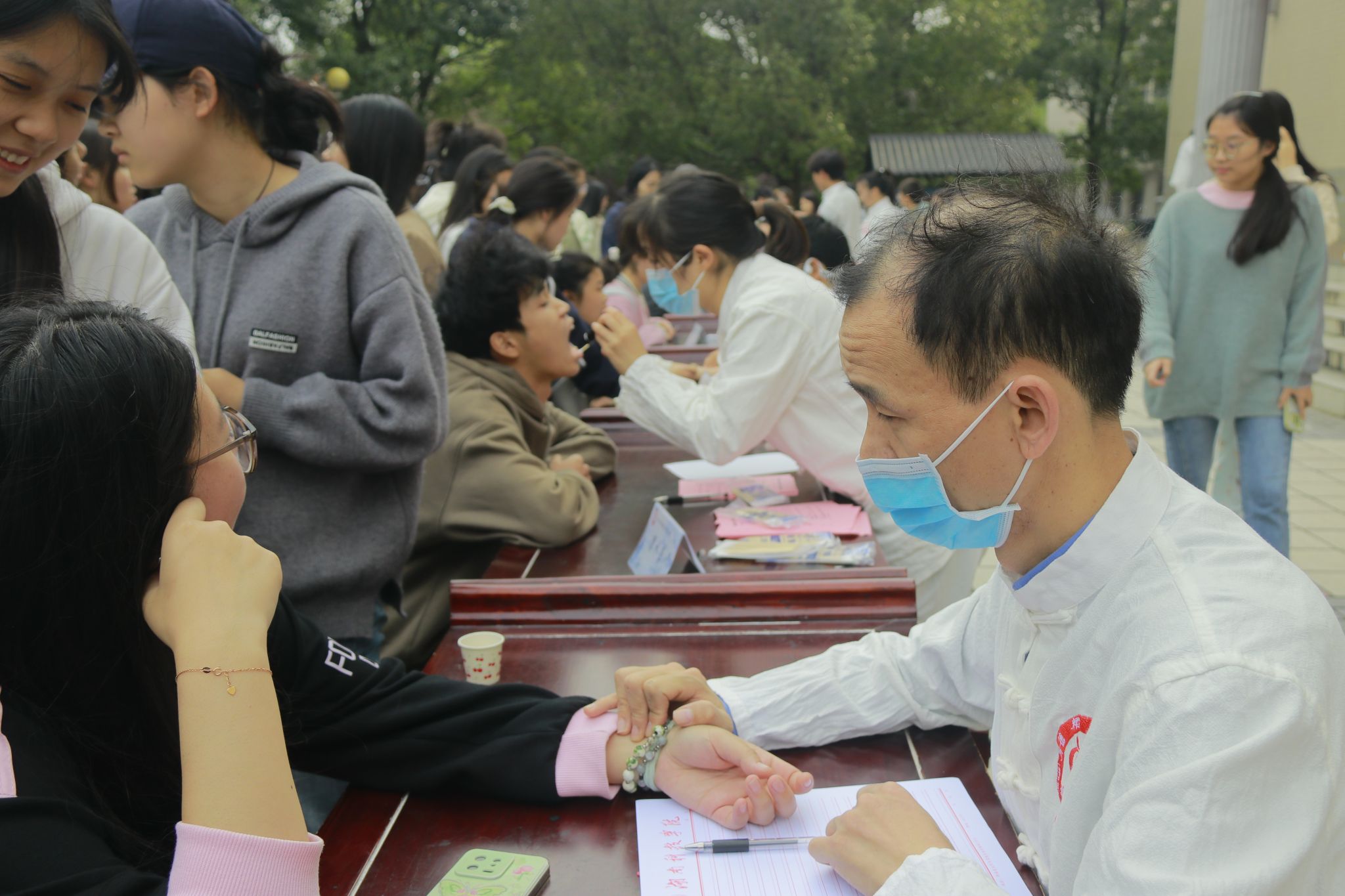 在桃园“一站式”学生社区前坪,医生们开展“一对一”“面对面”的把脉问诊以及中医体质辨识,细心诊查病情、耐心解惑答疑,根据不同的体质状态,给予师生有针对性的饮食、起居、运动、情志等方面的健康指导,同时介绍中医养生知识,普及防病治病医学常识。此外,现场师生还品尝了中药茶饮,体验中医面膜,亲手制作中药香囊、艾叶锤等传统中医药制品,亲身参与中医药用品的制作过程,感受其中的乐趣与奥秘。