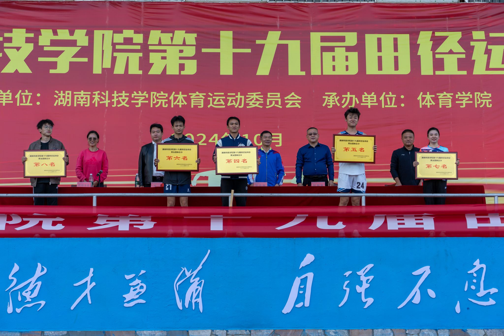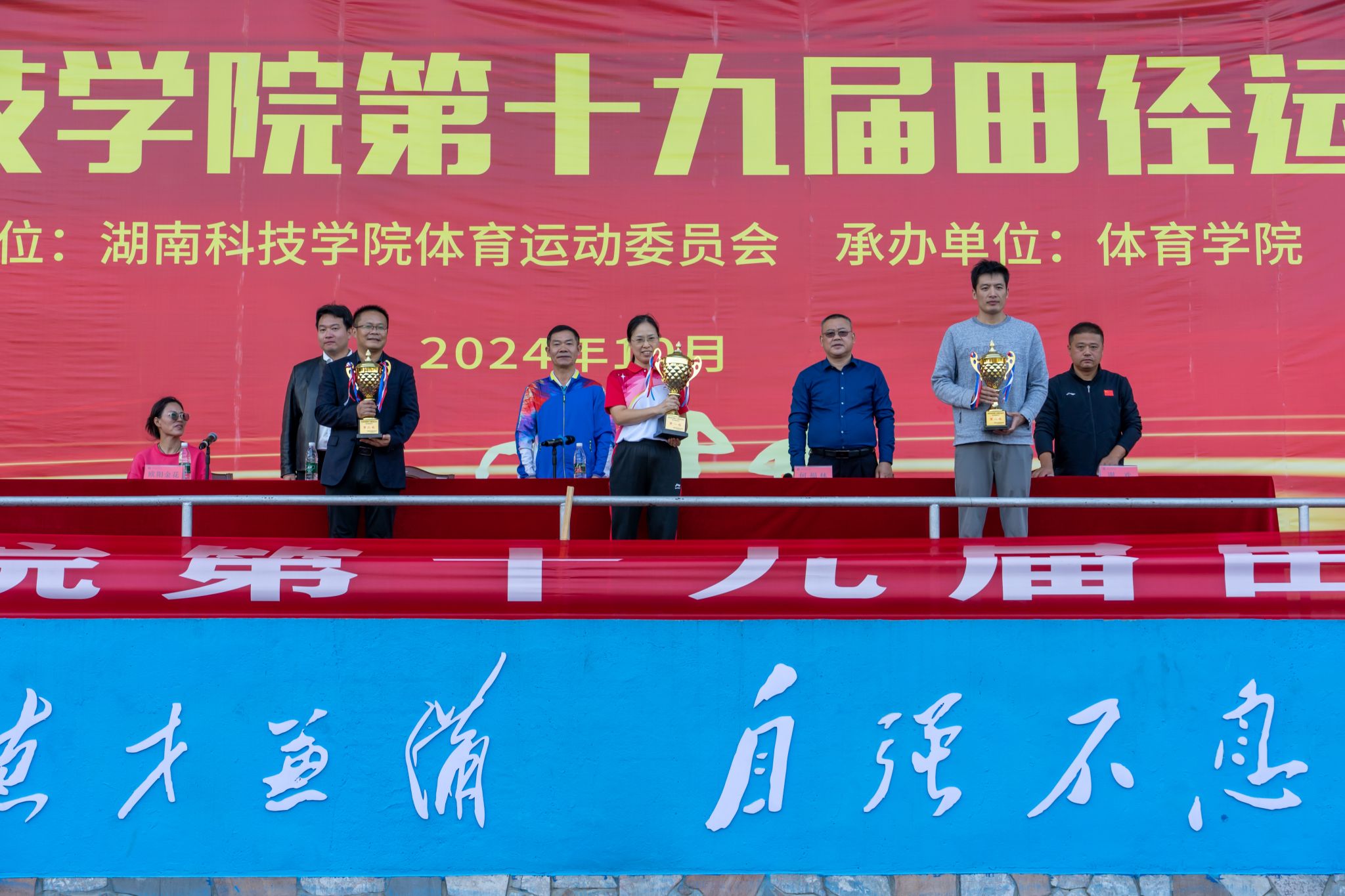 本网讯(记者 唐晶 石龙凤 吴若珣)11月1日,经过两天的激烈角逐,学校第十九届田径运动会圆满落下帷幕。校党委委员、副校长吴小林,党委委员、副校长、校体委主任何福林出席闭幕式,为获奖运动员和先进团体颁奖,并向他们表示祝贺。