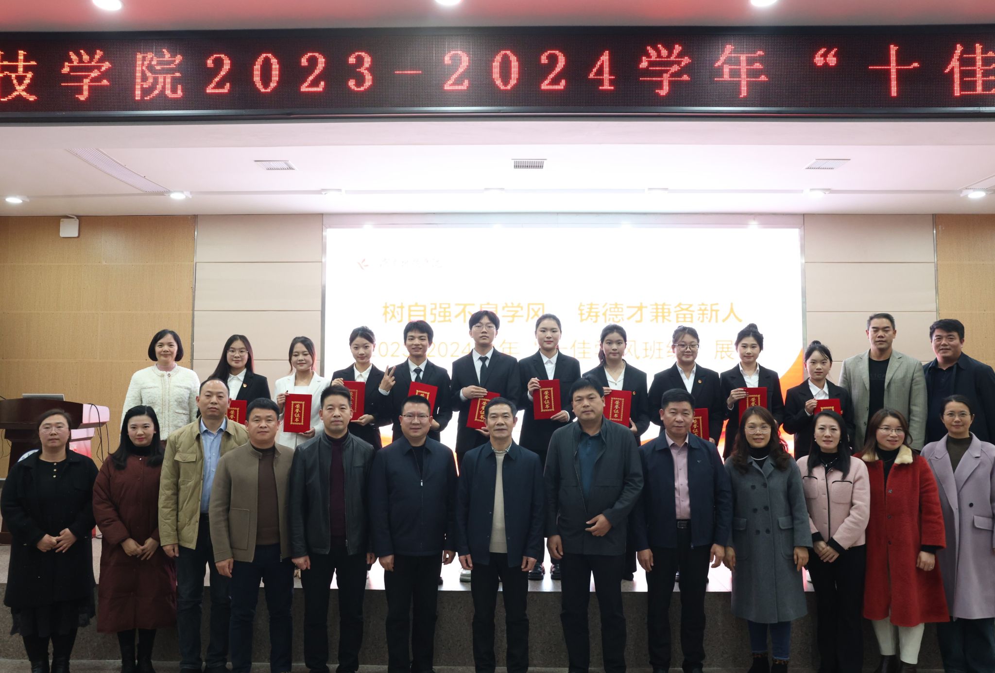 活动共评选出电科2202班等10个“十佳学风班级”,并对荣获2023-2024学年优良学风班级进行表彰。秘书2401班班长张佩说:“一个班级的优良学风就像一场春雨,能让同学们在潜移默化中获得更多的成长和进步。”智造2302班团支书潘豪俊表示:“在今后的学习生活中,我一定要与同学们共同努力,让好学风成为班级的风向标,影响带动每一位成员。”