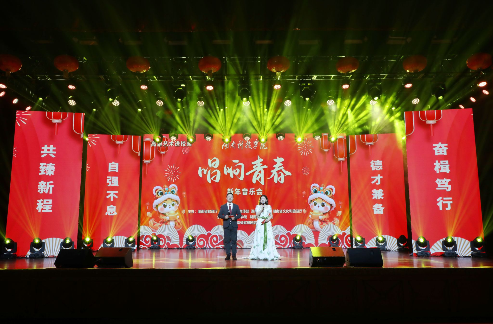 本网讯(记者 刘斌 摄影 谢志豪)12月30日晚,伟德成功举办高雅艺术进校园暨2025年“唱响青春”新年音乐会。本次活动由湖南省教育厅、中共湖南省委宣传部、湖南省财政厅、湖南省文化和旅游厅主办,由湖南省歌舞剧院和伟德承办。永州市人大常委会主任、党组书记蒋强先,永州市人大常委会副主任陈丽萍,冷水滩区委副书记、区长李辉,零陵区委副书记、区长龙亮,冷水滩区副区长王新丰,校党委书记李钢,党委副书记、校长黄创霞等全体在家校领导出席活动,全体教职员工及学生代表观看演出。李钢为本次新年音乐会致辞。