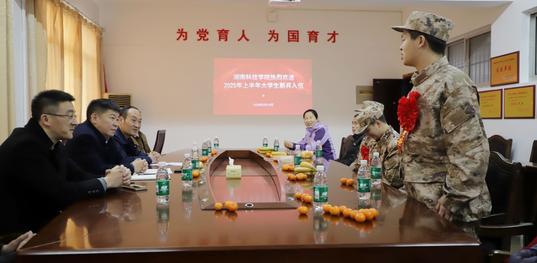 会后,杨涛代表学校向应征入伍学生发放应征入伍纪念品,全体参会师生合影留念。