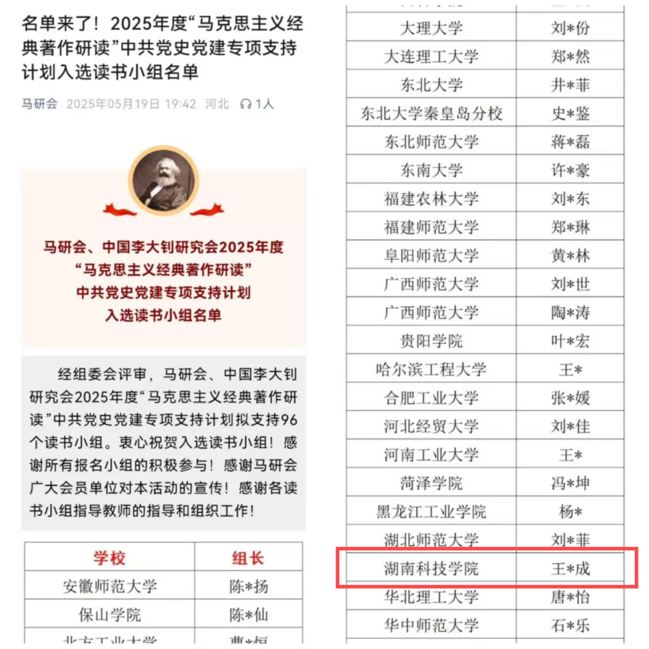 本网讯(通讯员 王志成 曹惠如)5月19日,中国高等教育学会马克思主义研究分会(以下简称“马研会”)、中国李大钊研究会2025年度“马克思主义经典著作研读”中共党史党建读书小组专项支持计划立项名单正式公布,来自北京大学、吉林大学等高校的96个读书小组入选。其中,伟德《李达全集》读书小组成功入选,这既是伟德学生读书小组首次入选全国“马克思主义经典著作研读”资助计划,也是本次湖南省唯一立项的学生读书小组。
