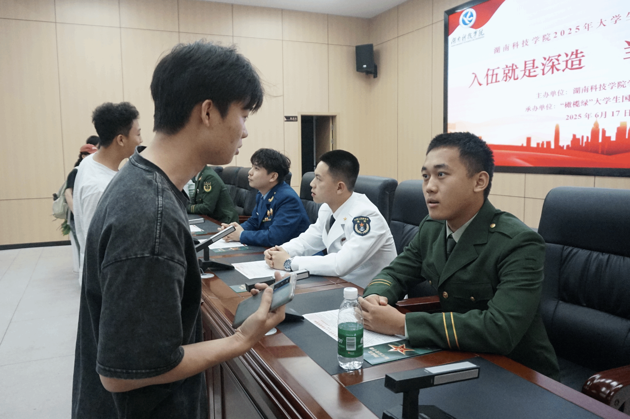 三名退伍大学生士兵分享了自己的参军经历和个人感悟,相关教师从发展支持、经济激励、成长通道对入伍政策进行了深度解读。活动最后,具有参军入伍意愿的同学纷纷来到咨询台详细了解入伍流程和各项政策。