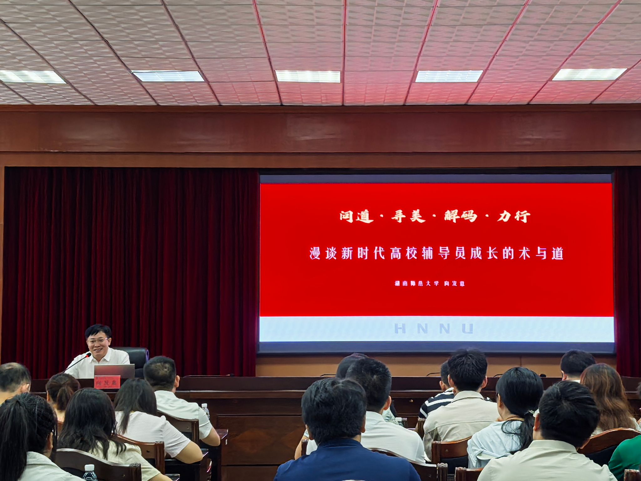 湖南师范大学教育科学学院党委书记向发意以《问道·寻美·解码·力行——漫谈新时代高校辅导员成长的术与道》为题,就如何成为一名教育型、研究型、事业型、智慧型辅导员进行了能力提升路径方面的指引。