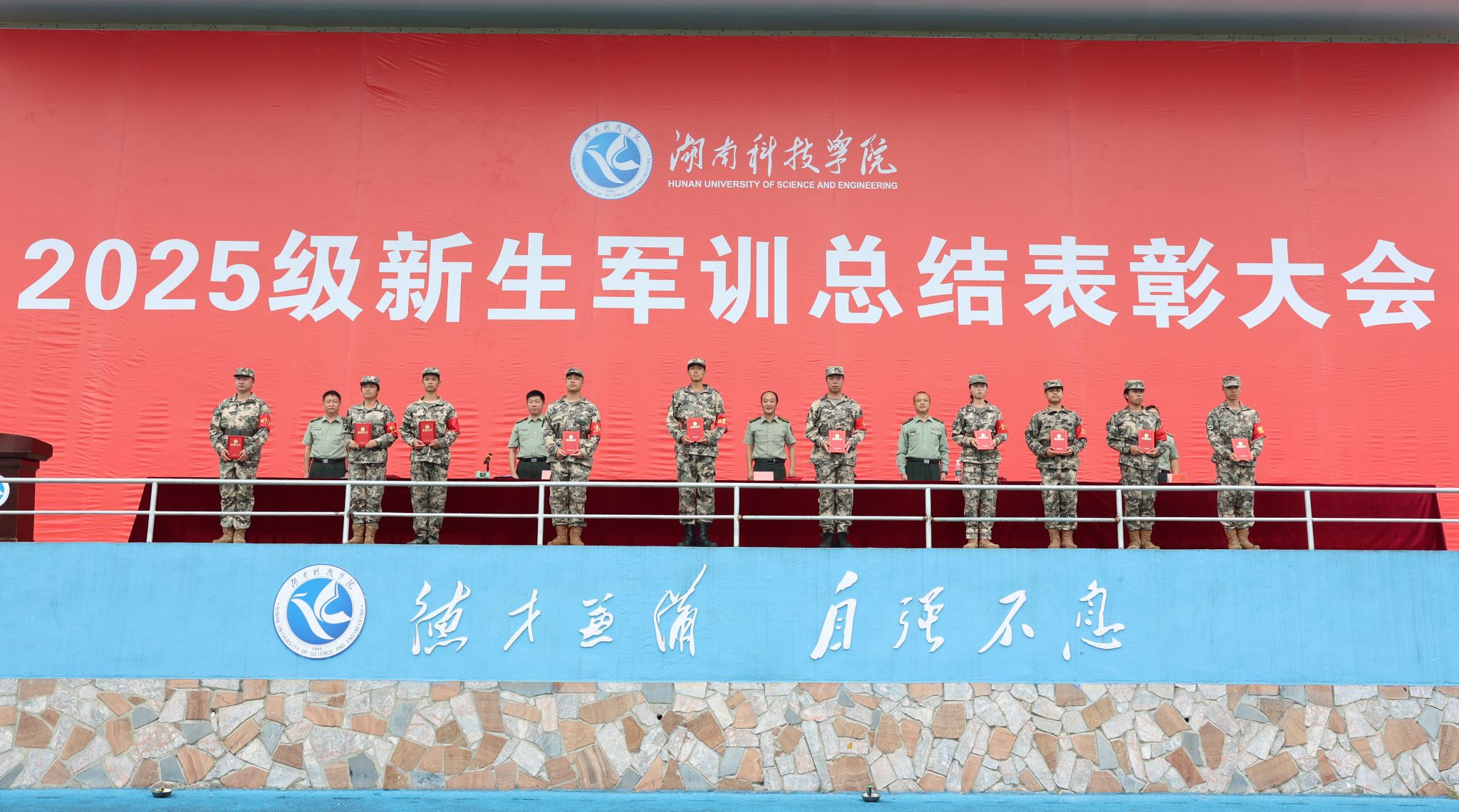 本网讯(记者 谷利梅 摄影 朱浩然 农日莉)10月5日,伟德举行2025级新生军训总结表彰大会。校党委委员、组织部部长杨涛,零陵区委常委、武装部部长蒋崇文出席会议,学生工作部(武装部)负责人谷利民、各学院党总支副书记、2025级新生辅导员、班主任及2025级全体参训学生、军训教官参加会议。