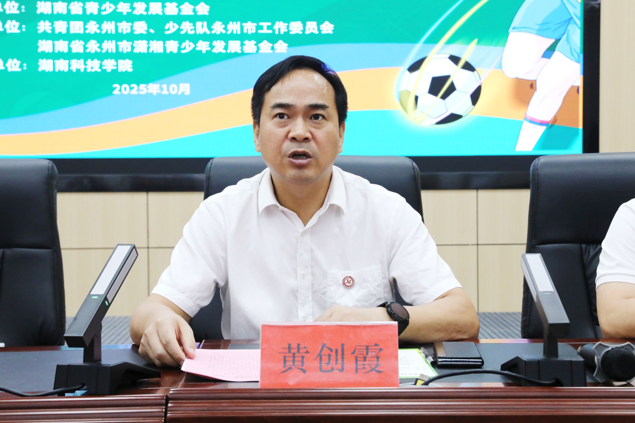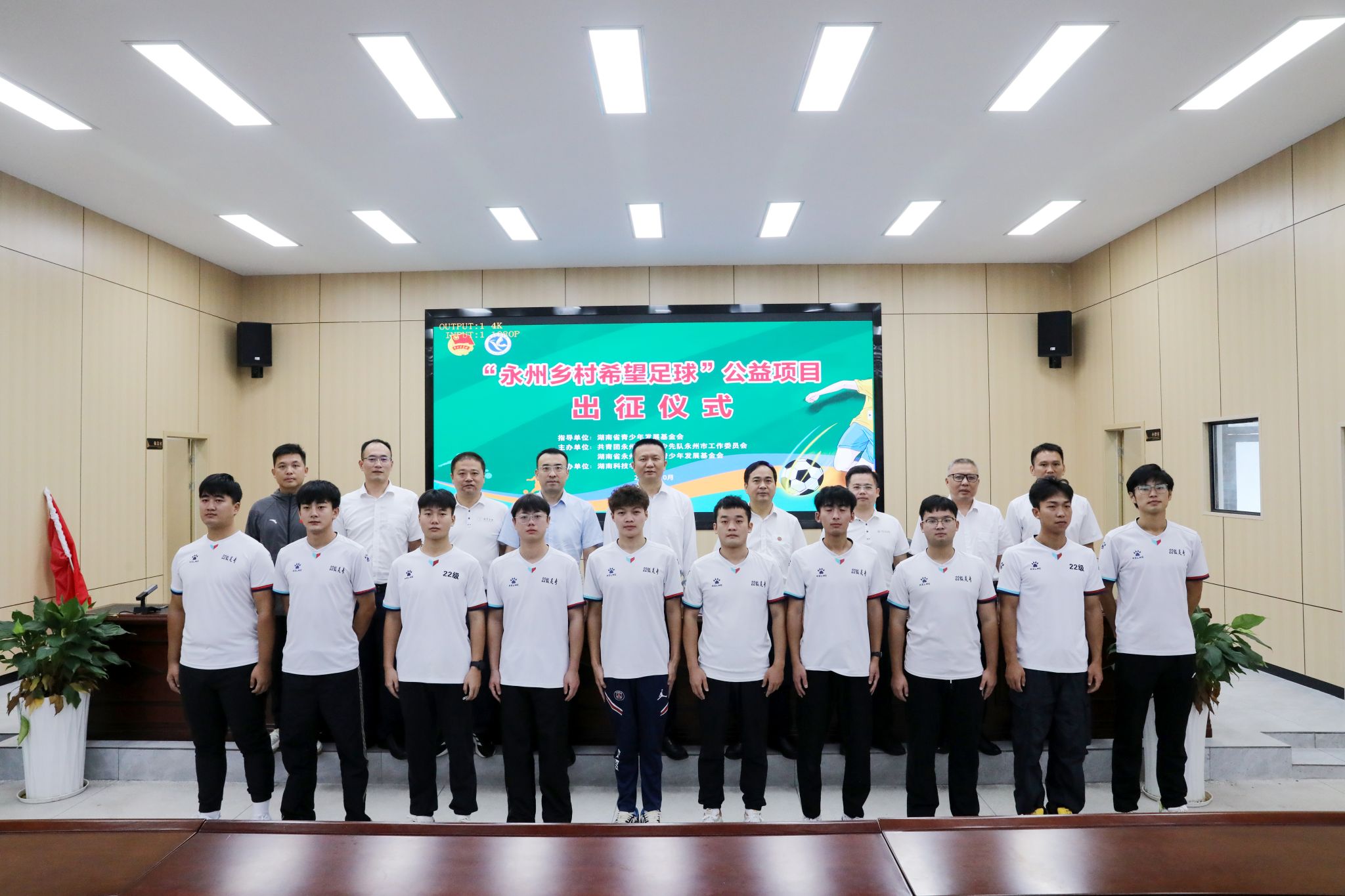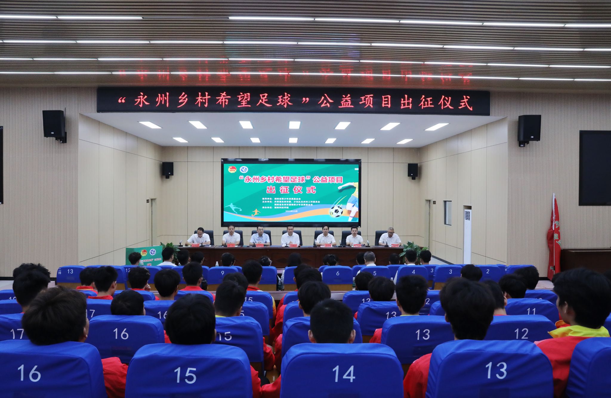 本网讯(通讯员 孙淑娴 摄影 谢志豪)10月16日上午,“永州乡村希望足球”公益项目出征仪式在学校明德楼举行。副市长肖质彬、校长黄创霞、团市委副书记李彬彬、团市委副书记唐泽彦出席出征仪式。肖质彬宣布大学生支教志愿者队伍正式出征。