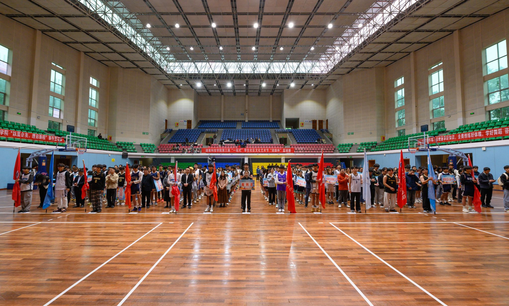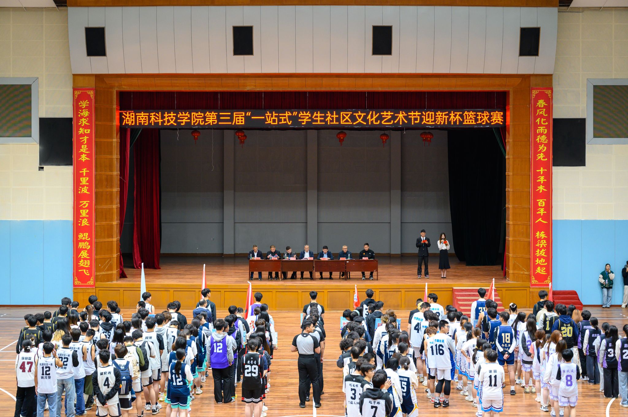本网讯(记者 万湘徽 摄影 杨芊澍)11月11日,学校体育馆内人声鼎沸、气氛热烈,第三届“一站式”学生社区文化艺术节“迎新杯”篮球赛正式开幕。校党委委员、副校长何福林出席活动,学生工作部、校团委、体育学院负责人,以及全校各学生社区参赛学生代表齐聚在现场,共同见证赛事启动。