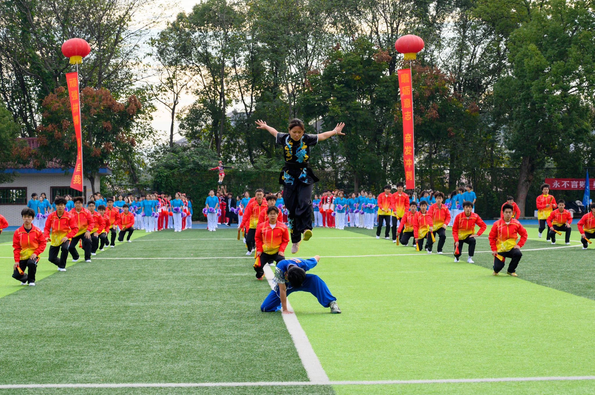 五颜六色的气球放飞天空,全场掌声雷动。在观众热情的欢呼与喝彩声中,体育学院的健儿们表演节目《武林风采》,打出了东安拳的气势,打出了运动健儿们的态度与信心。美术学院、体育学院、音乐与舞蹈学院联合演绎的啦啦操《青春正当时》活力登场,这支队伍曾亮相湘超赛场,为永州VS长沙赛事助力,马上又将助阵永州迎战娄底。校运赛场与湘超赛场相连,动感舞姿串联赛场激情,绽放竞技与活力的双重魅力。