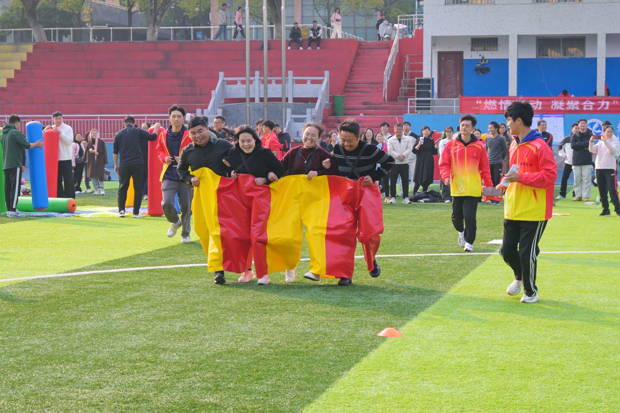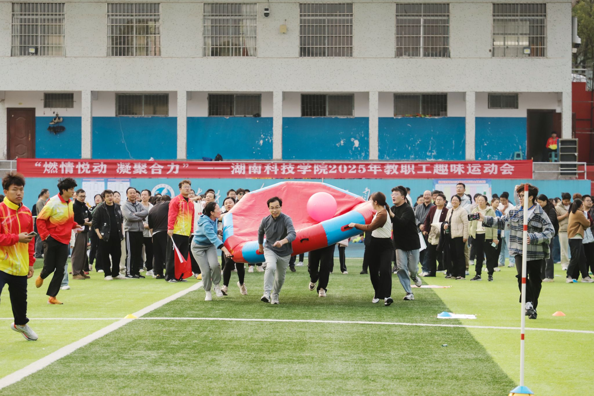 “稳住!还差一步!”“加油,你们最棒!”……教职工们笑容热烈、配合默契,参赛队员们劲头十足,一旁的拉拉队举着牌子呐喊助威。喝彩声、鼓劲声、欢笑声回荡在赛场的每一个角落。
