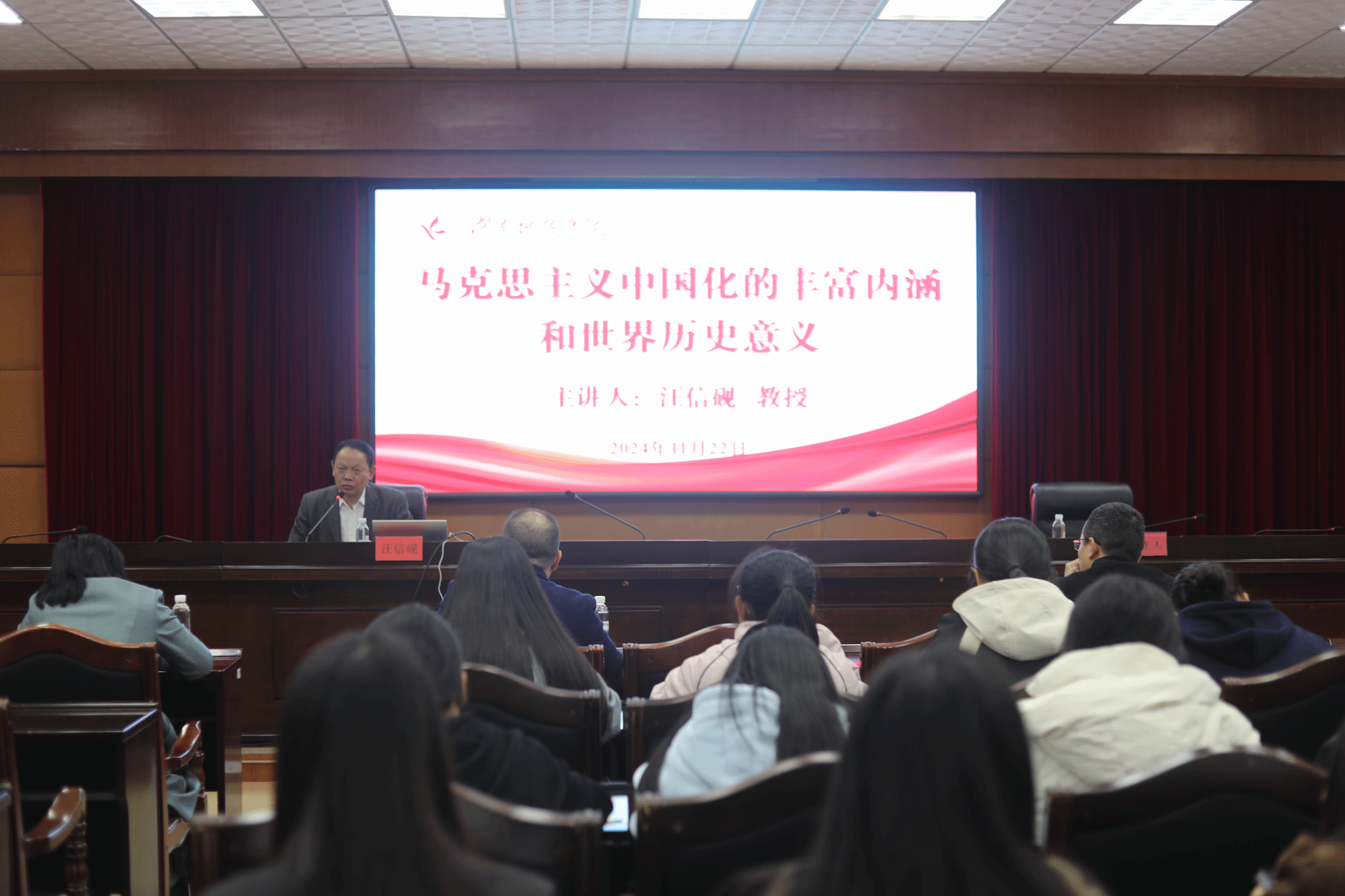本网讯(通讯员 陈小燕)11月22日,武汉大学人文社会科学资深教授、哲学院教授、博士生导师汪信砚应邀来校,在行政楼801会议室为伟德师生作了题为《马克思主义中国化的丰富内涵和世界历史意义》的学术讲座,讲座由党委委员、副校长何海教授主持。