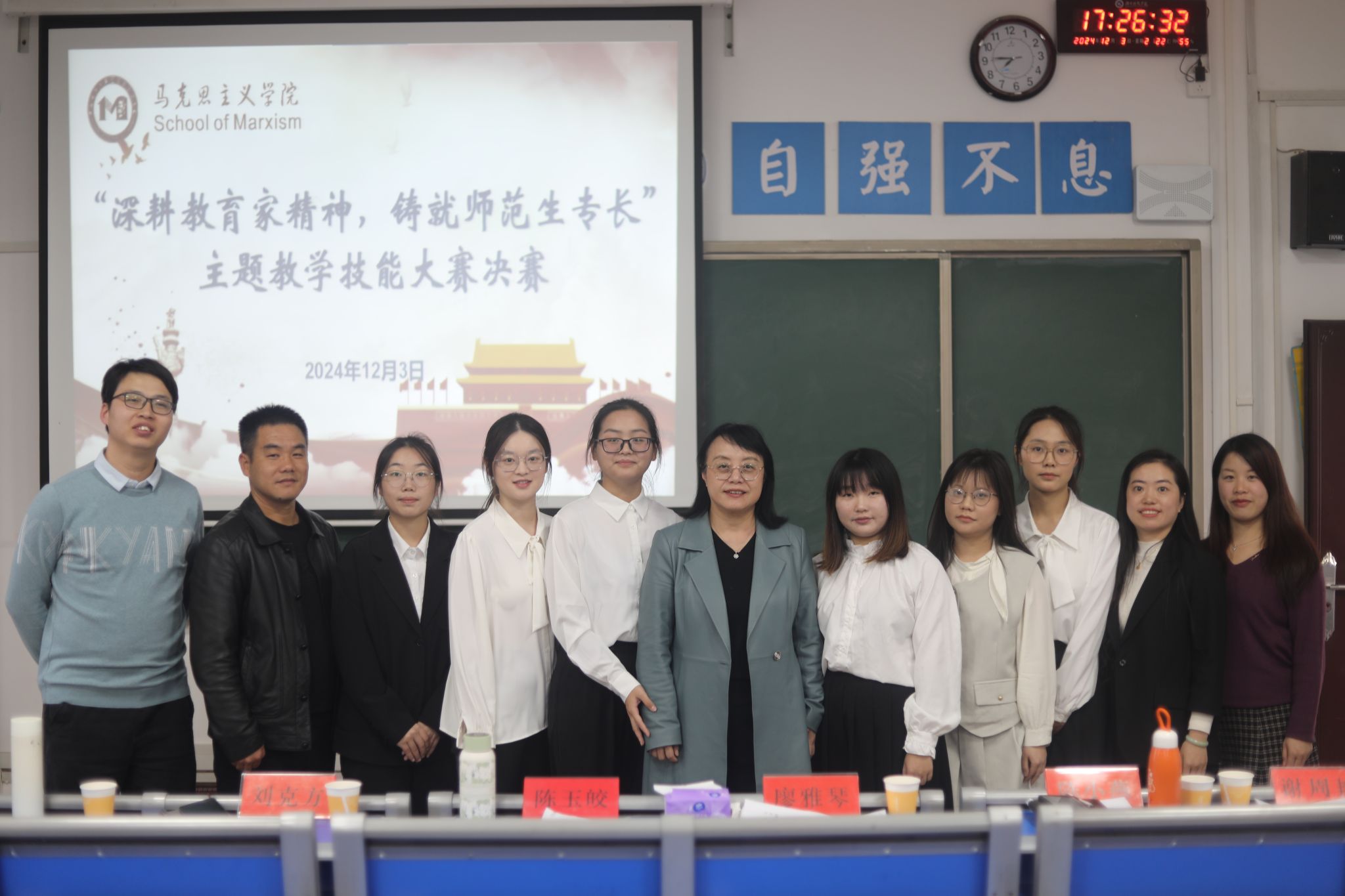 本网讯(通讯员 杨鑫杰 易淑妍)12月3日,马克思主义学院于鹤鸣楼501教室成功举办以“深耕教育家精神,铸就师范生专长”为主题的师范生技能大赛决赛。由马克思主义学院院长廖雅琴、党总支书记陈玉皎以及优秀青年教师陈小燕、刘克方、谢周艳共同担任评委。