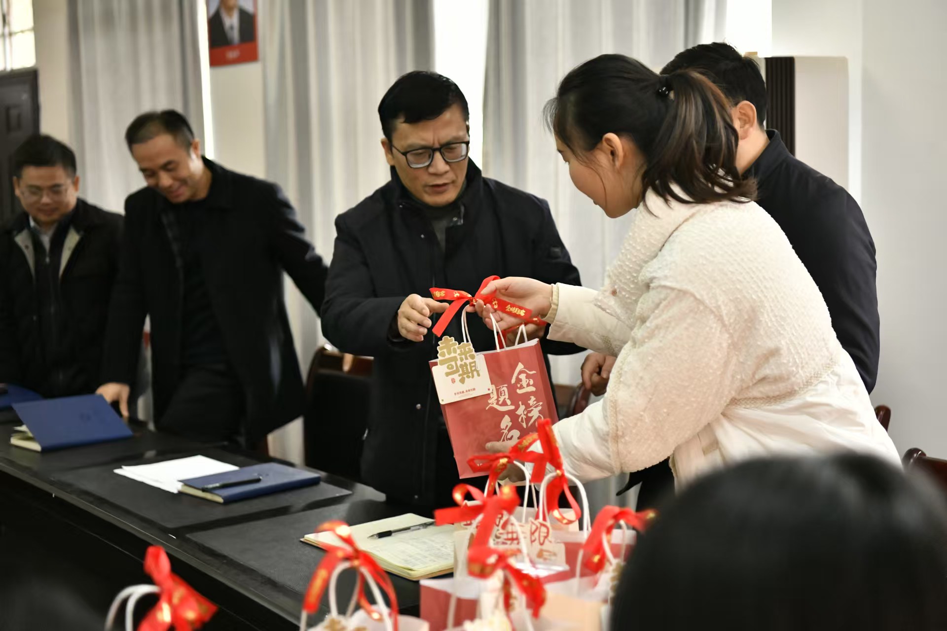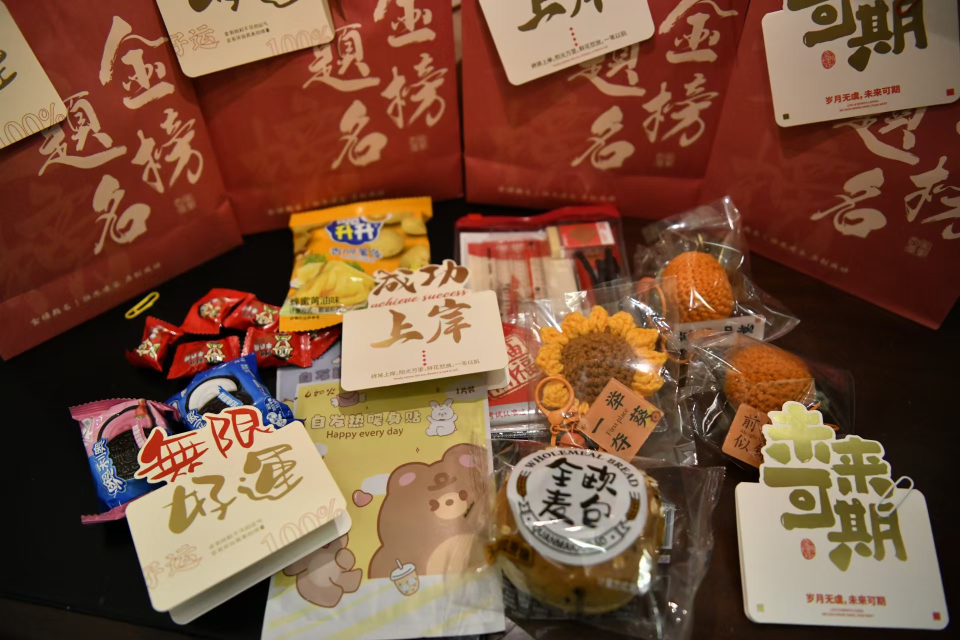 院长黄渊基充分肯定学子们的辛勤努力,勉励大家付出总有回报,并祝福考研学子们金榜题名、成功上岸。老师们还为考研学子发放了精心准备的考研冲刺大礼包,旺旺奶糖与脆升升薯条,承载着“旺运亨通”“步步高升”的祝愿,面包带来“包上”的好运寓意,暖贴送去冬日温暖,“一举夺魁”的向日葵、“前程似锦”的橙子、“一举夺魁”的钥匙扣,一套实用文具助力学习冲刺,皆表达了对同学们考研成功的殷切期望和美好祝福。