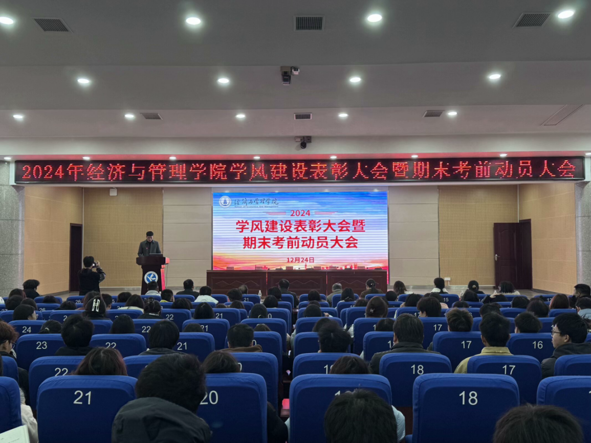 袁岳驷宣读表彰文件,本次大会表彰了十佳学风、优良学风班级、国家奖学金、国家励志奖学金、校级奖学金、单科最高分并对经济与管理学院2024年上半年大学生英语四六级最高分获得者和学校第二届一站式学生社区文化艺术节——“笔尖筑梦,流墨生香”学习笔记评比活动获奖者进行颁奖。