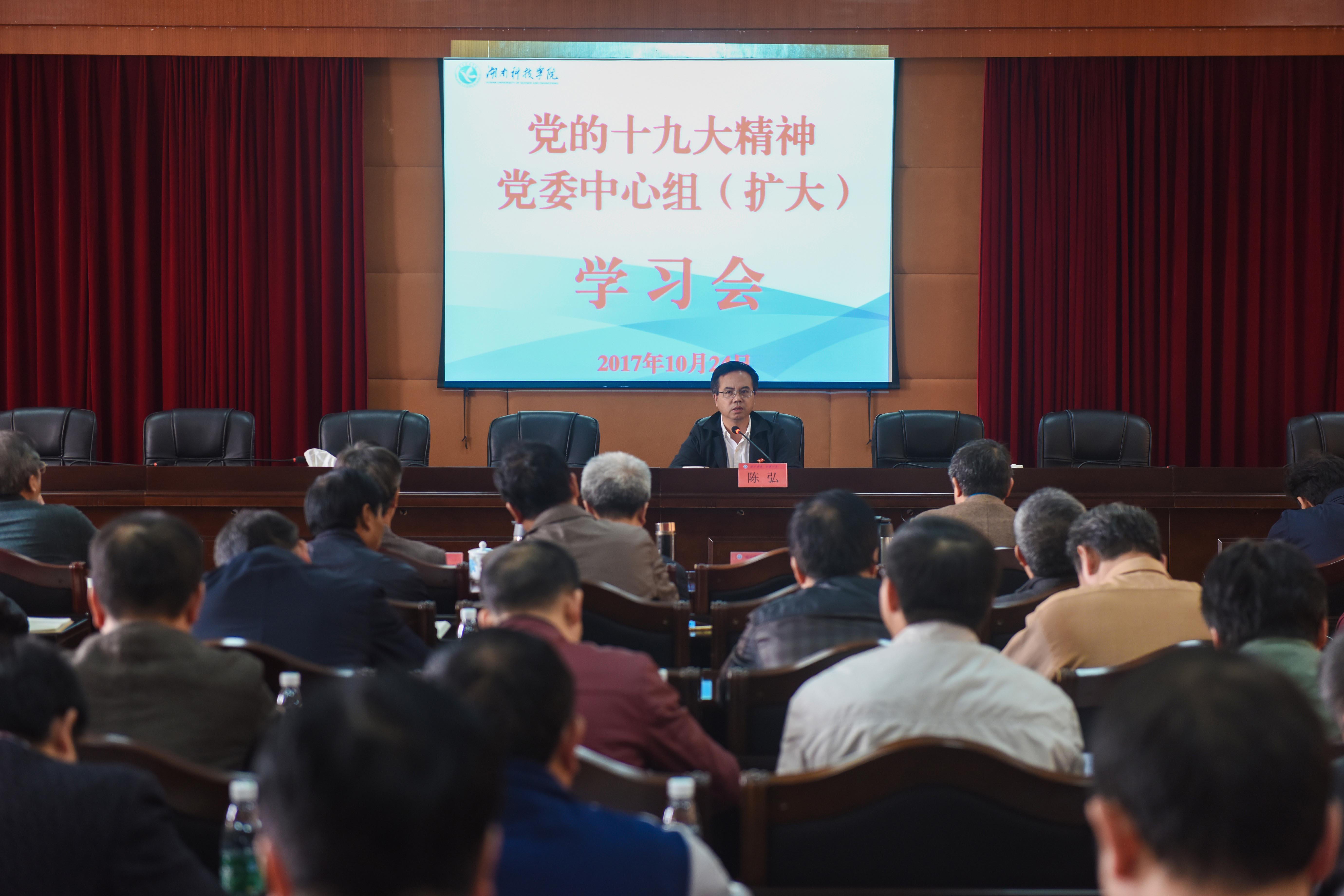 本网讯 10月24日下午,学校举行党委中心组(扩大)学习会,全体在校领导、 中层干部参加专题学习。会议由校党委书记陈弘主持。