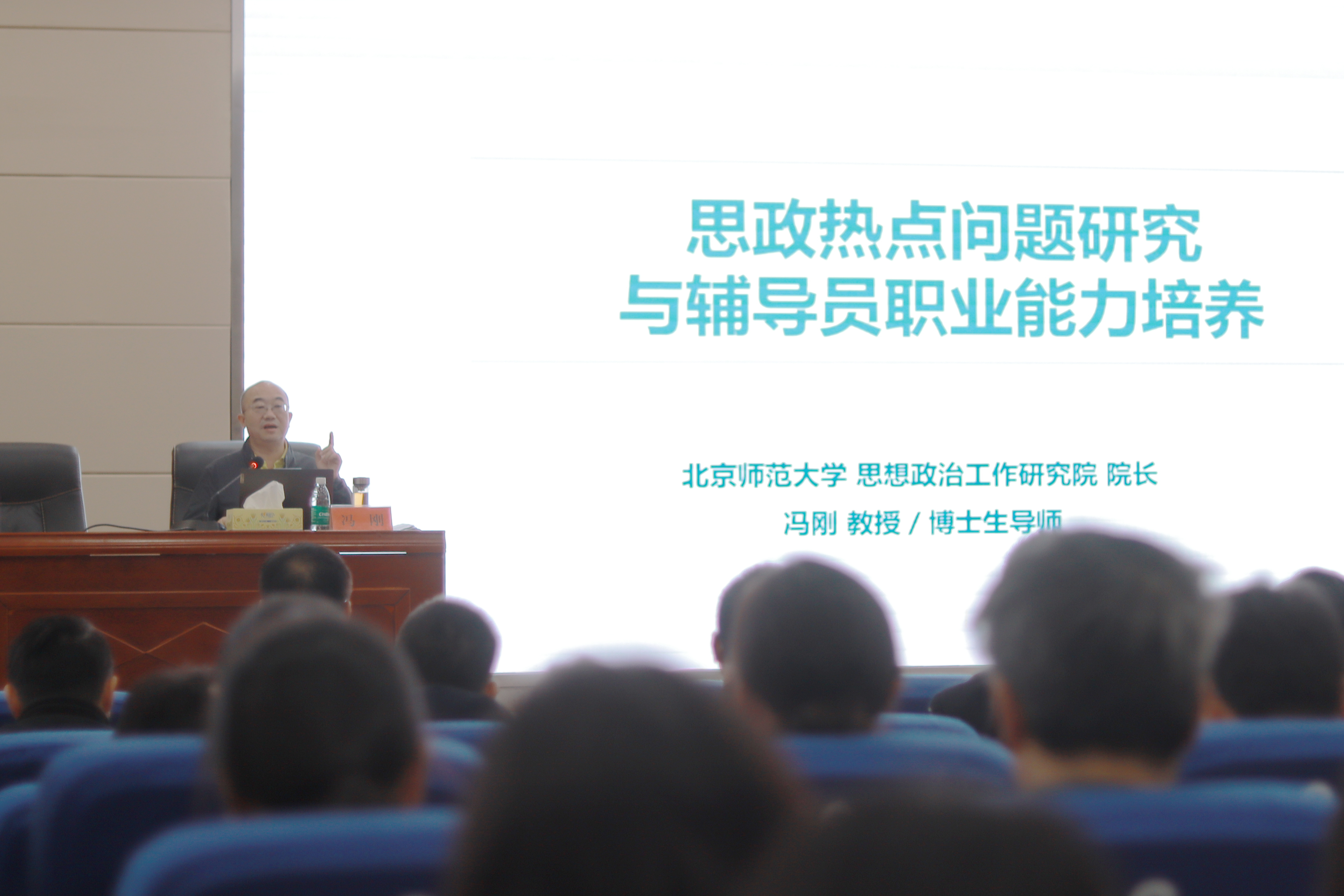 冯刚以“思想政治教育热点问题与辅导员职业能力提升”为主题,围绕思想政治教育热点问题、思想政治教育政策发展研究和辅导员能力的提升策略三个方面展开论述,对立德树人和时代新人之间的内在联系进行系统阐释和深刻分析。