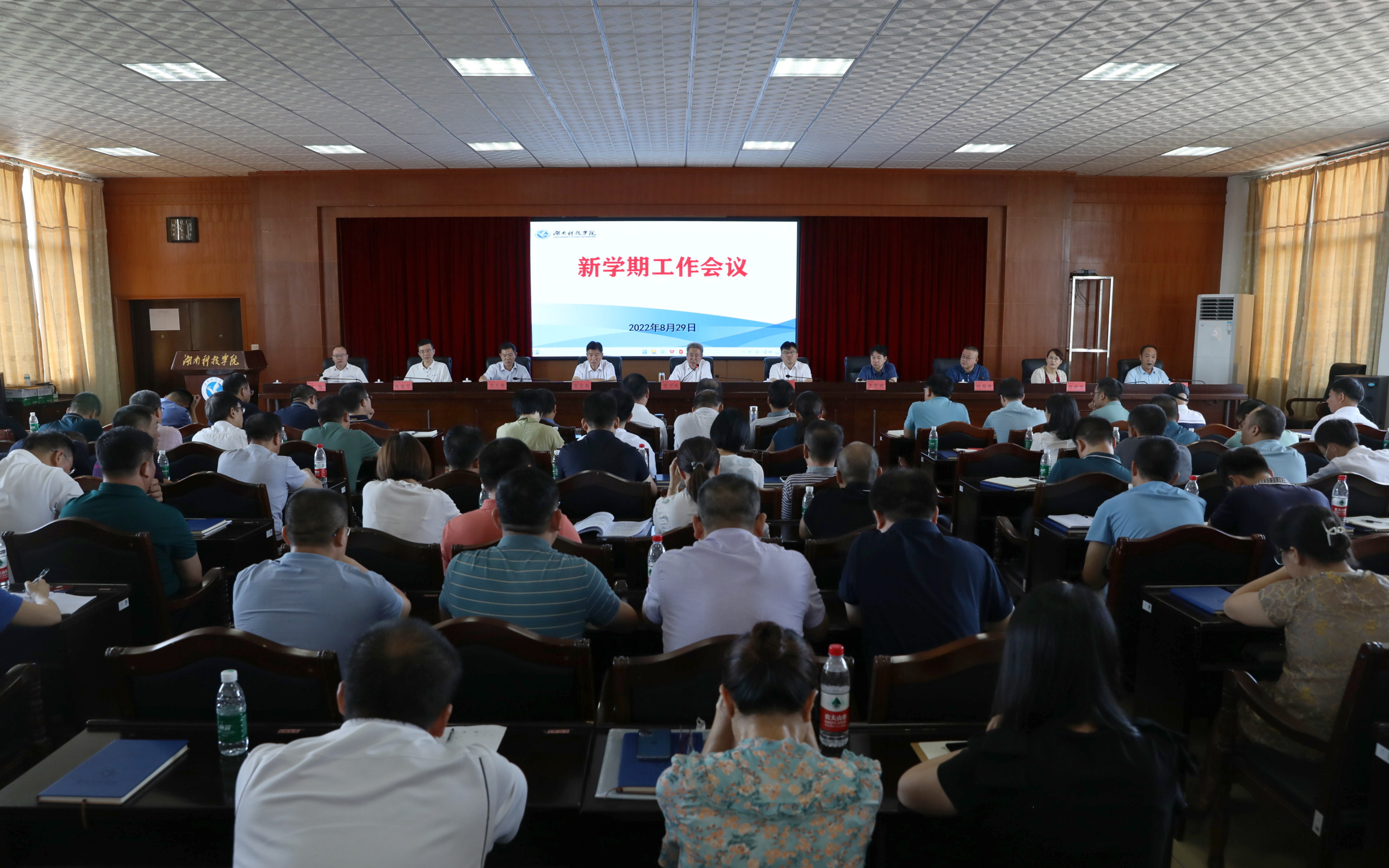 本网讯  8月29日上午,学校召开2022年秋季新学期工作会议,全面总结上学期和暑期工作,对新学期重点工作进行重要部署。党委书记曾宝成强调,新的学期任务艰巨、使命光荣,要时刻牢记初心使命、笃定奋斗目标,认清形势、自我加压,迎接挑战,拥抱机遇,奋力推进地方性高水平应用型大学建设,以实际行动迎接党的二十大胜利召开。全体校领导、党委委员出席会议,全体中层参加会议。