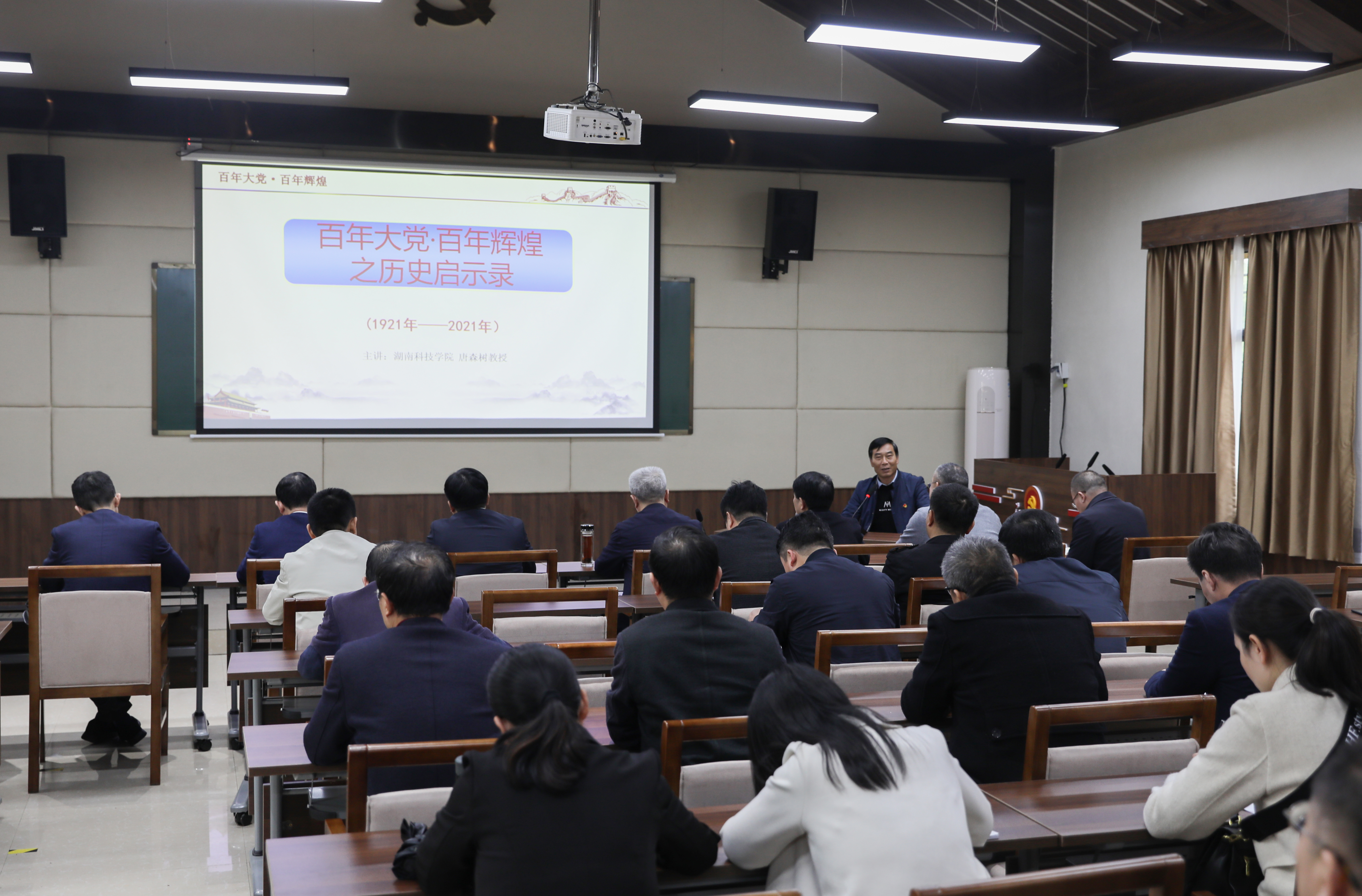 在党委理论学习中心组(扩大)第五次集中学习暨“学史增信”专题党课上,大家观看了《半根筷子的故事》党性教育片,聆听红军与当地老百姓留下的感人故事。“因为有信仰,所以就忠诚;因为忠诚,所以愿意去担当;因为有担当,所以才会不惧牺牲。”马克思主义学院唐森树教授以《百年大党·百年辉煌之历史启示录》为题,“理论之源、信仰之光、精神之力、求是之风、力量之基、健壮之根”等六个方面,带领大家回顾了中国共产党百年奋斗之路的光辉历程,并结合“学史增信”专题学习,对“信仰之光”进行了深刻阐释,他提到,信仰之光是坚如磐石理想信念的引领,要让信仰之光照亮如磐的初心,照亮奋进之路。