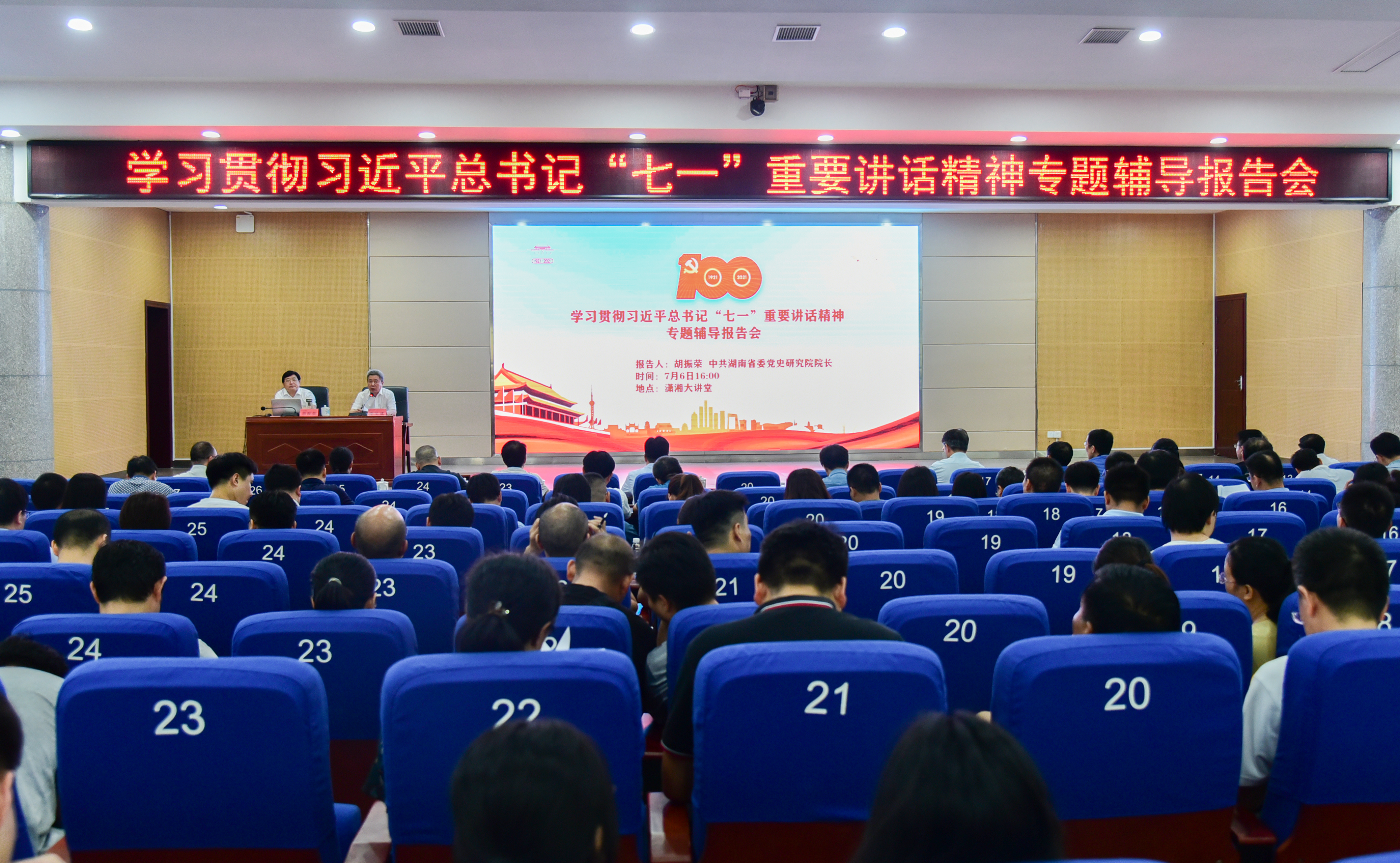 本网讯 7月6日下午,学校举行学习贯彻习近平总书记“七一”重要讲话精神专题辅导报告会。中共湖南省委党史研究院院长胡振荣应邀来校作专题辅导。省委党史研究院综合部主任、一级调研员刘文典,市委党史研究室主任李祥红,新田县委副书记易先平,在家校领导及师生党员代表600余人聆听专题辅导报告。校党委书记曾宝成主持报告会。