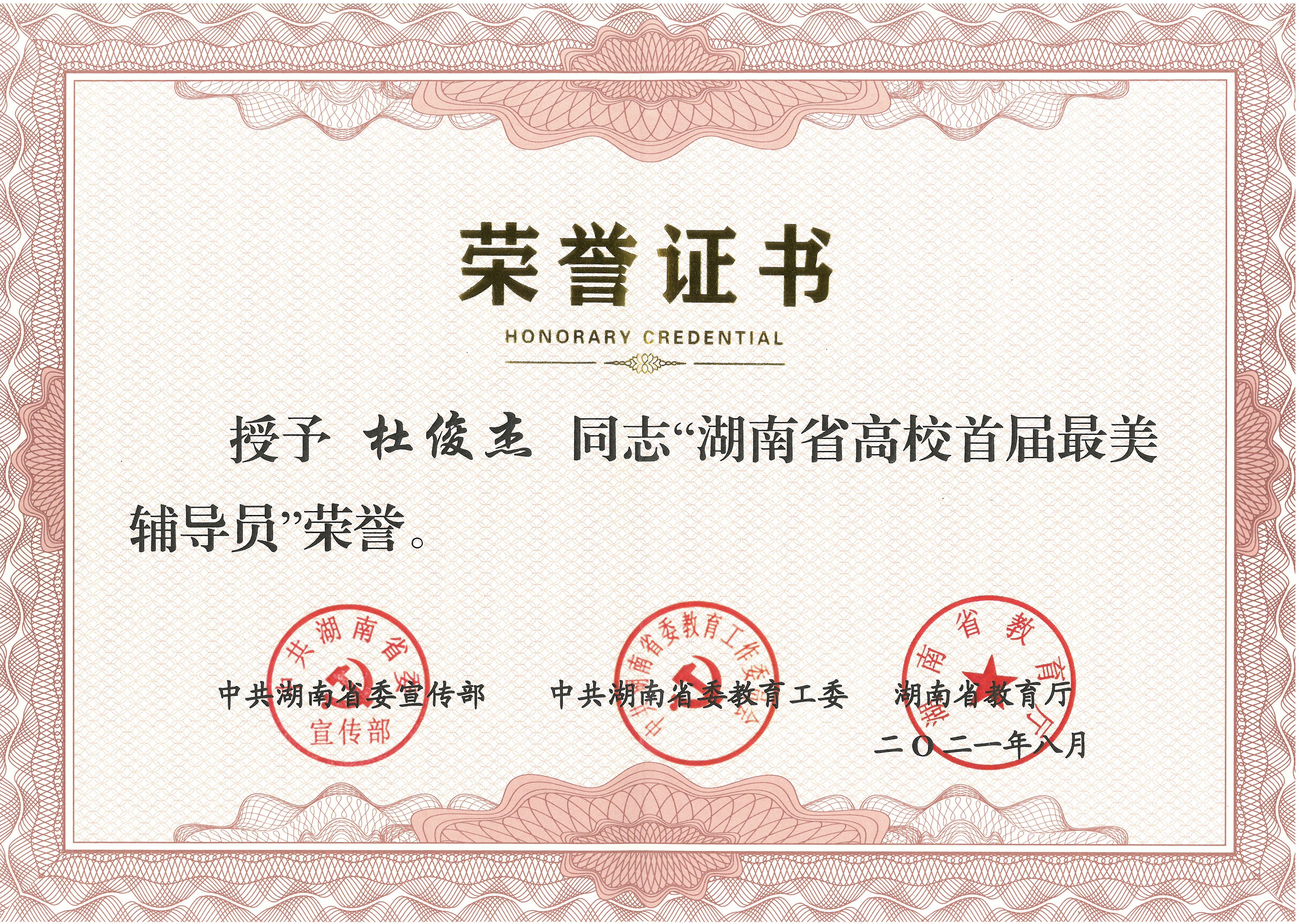 【名片】杜俊杰,中共党员,2015年研究生毕业进入伟德源自英国1946工作,现任理学院党总支组织委员、2020级辅导员、学工办副主任。2018年4月,参与的“‘心晴’特色成长辅导室”被评为湖南省大学生思想道德素质提升工程优秀建设项目;2019年11月,获第六届湖南省青年文化艺术节绘画类国画组铜奖;2021年6月获评2020湖南省高校辅导员年度人物。2021年8月获评首届“最美辅导员”。